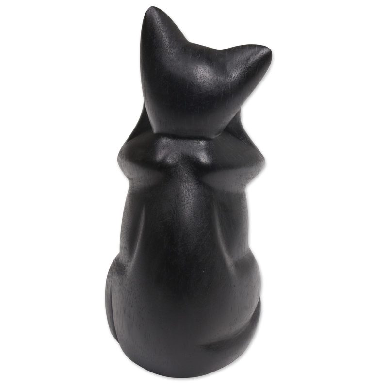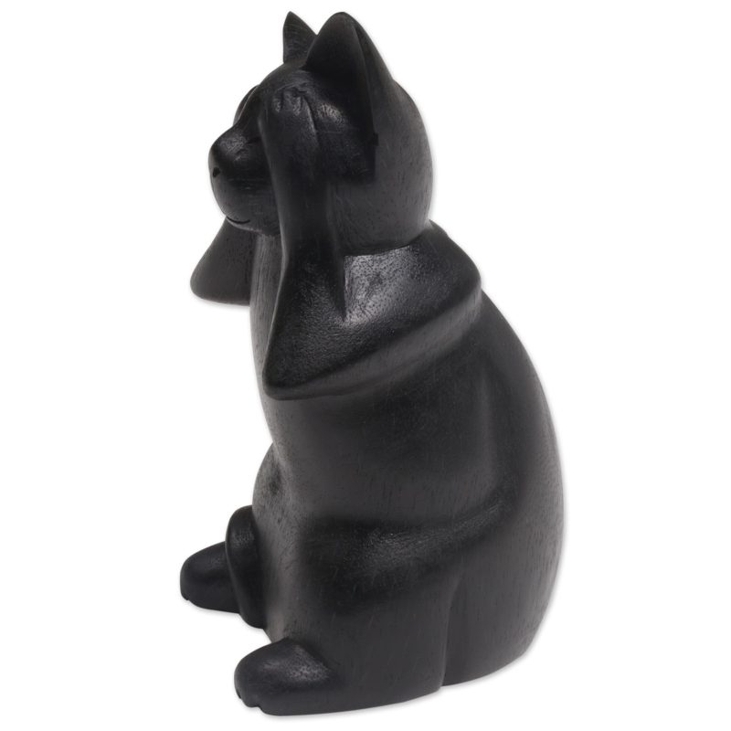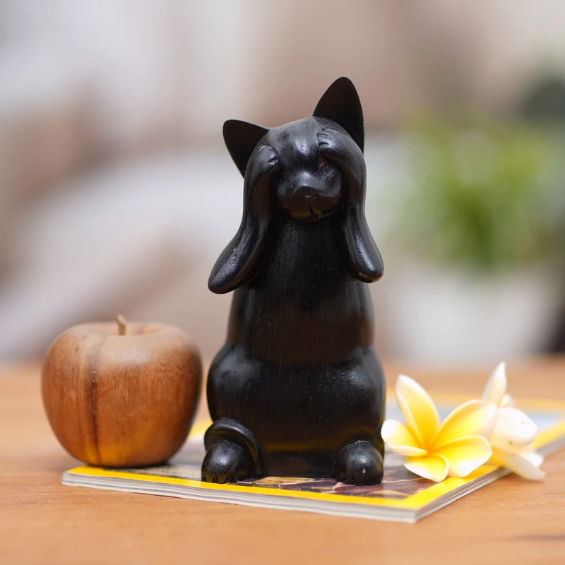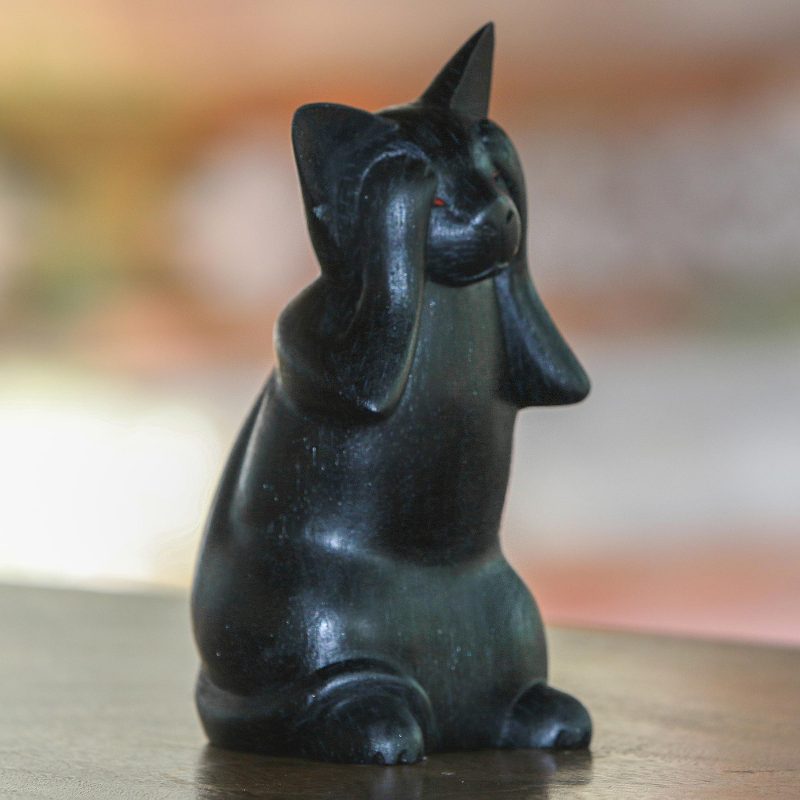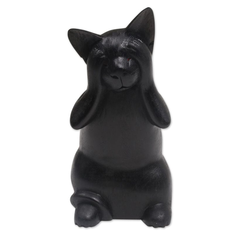 Hand-carved of Balinese suar wood, this cat holds its paws to its eyes, embodying the maxim "see no evil." Nengah Sudarsana designs the sculpture, giving it a solid black finish.