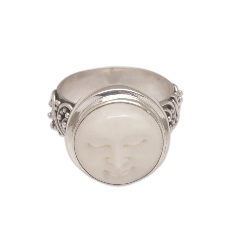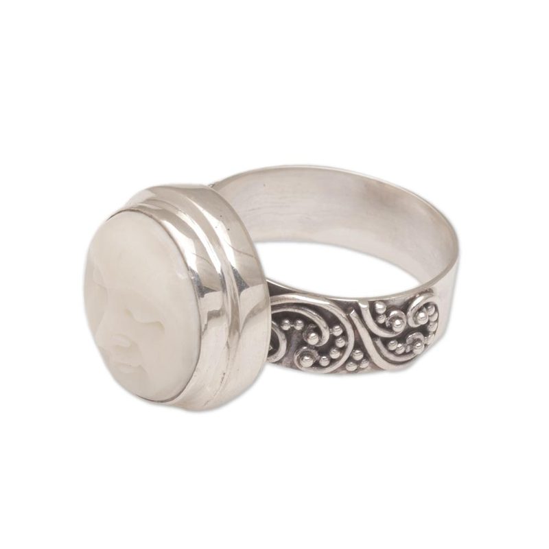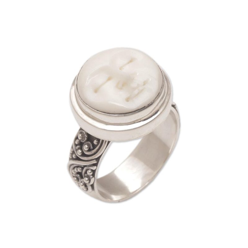 With the relaxed expression that accompanies tranquil rest, the face on this ring exudes serenity and calm. Buana carves the smooth visage from natural bone with admirable detail. The face centers a sterling silver ring embellished with traditional Balinese jawan (granule) and bun (wirework) motifs.