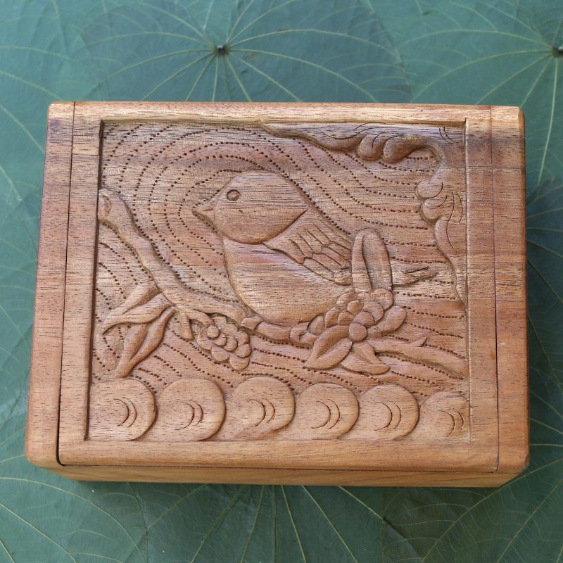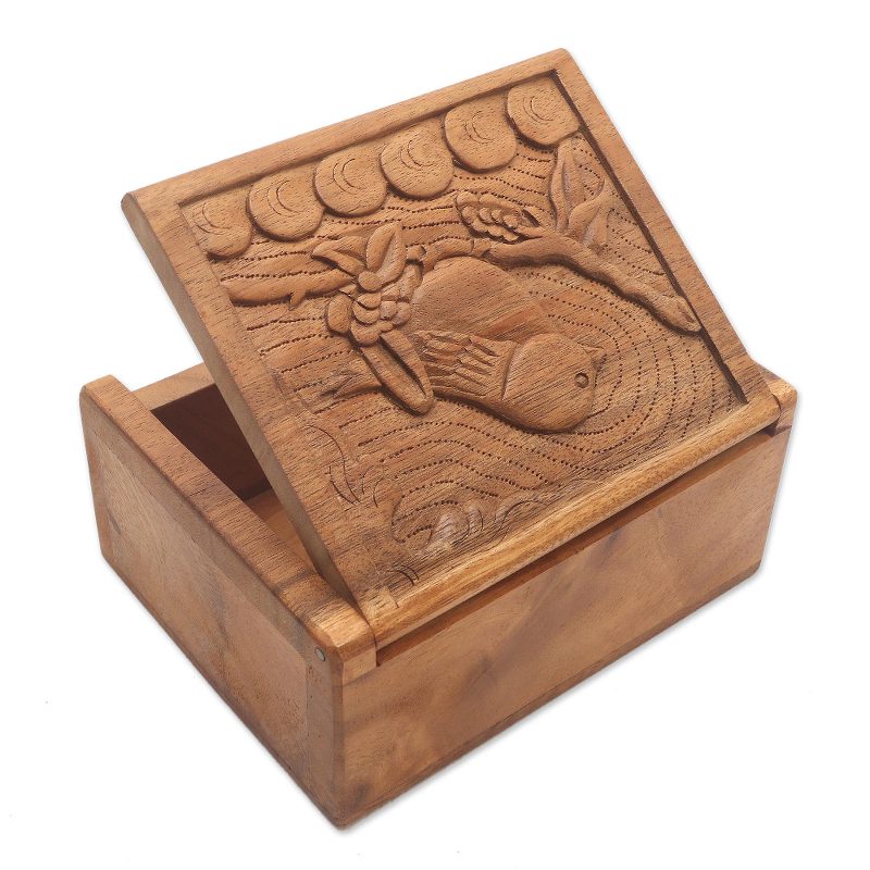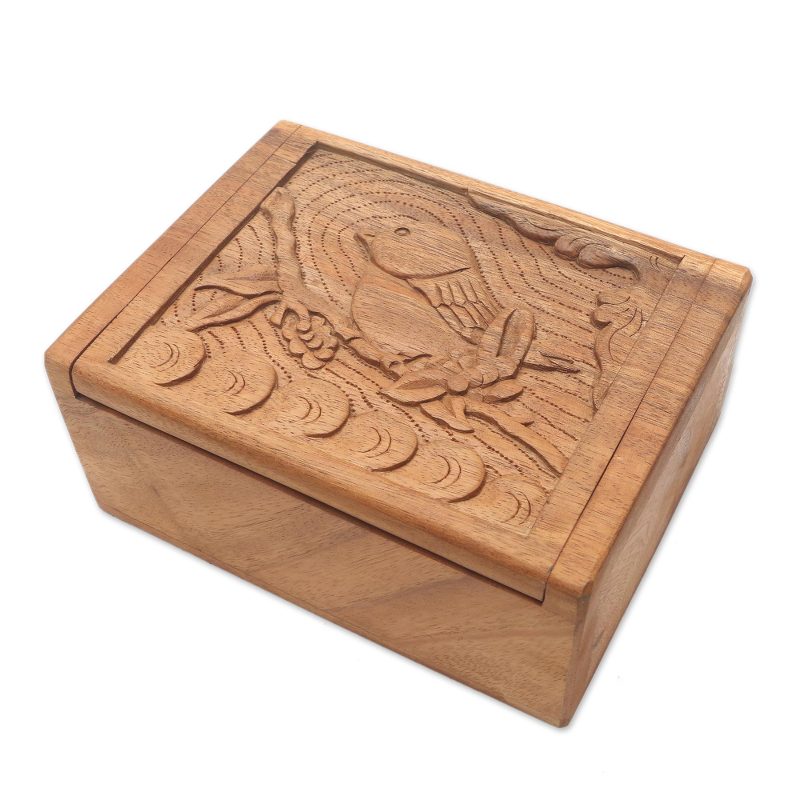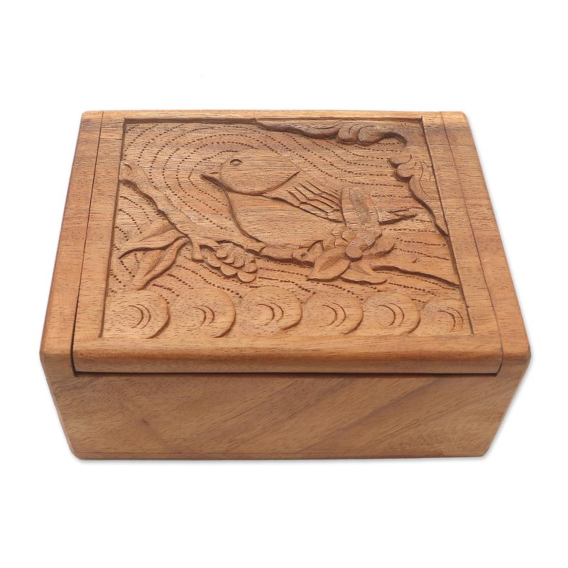 Backed by our 100% Happiness GuaranteeA tiny songbird holds fast to a twig in this suar wood box presented by Bali's Eka. The low-relief design is hand carved and features a hinged lid and unlined interior.