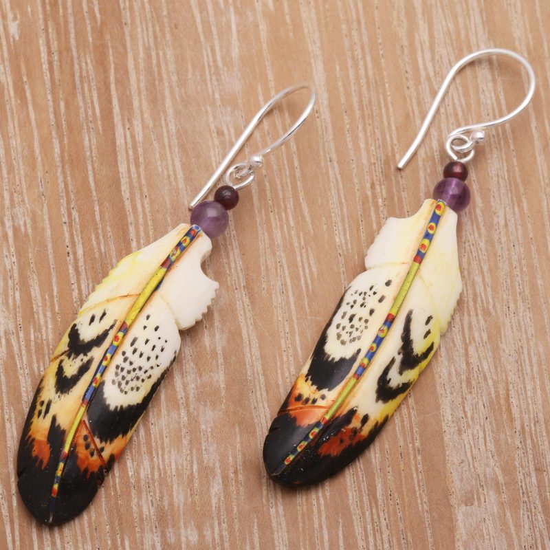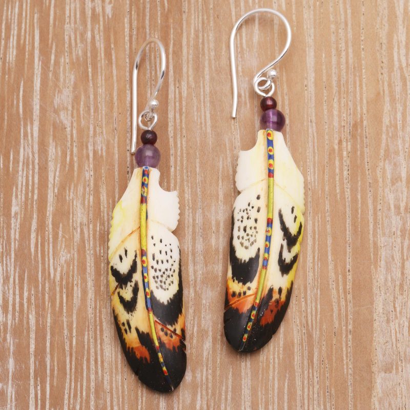 Hand-carved from bone and carefully painted, two delightful feathers dangle elegantly. Balinese artisan Ayu Ary creates these earrings, which are accented by beaded gemstones of amethyst and garnet. Each earring swings from a hook of sterling silver.