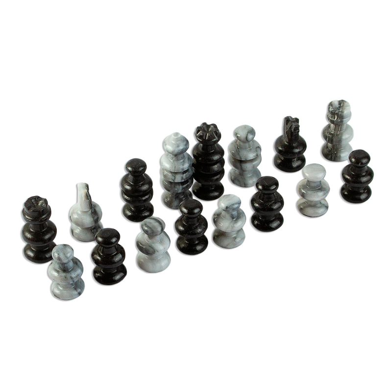 A sophisticated combination of variegated grey marble and black obsidian makes an elegant design. Carefully crafted by the Sierra family, this handsome set of chess pieces typifies Mexican artistry.