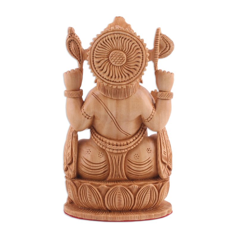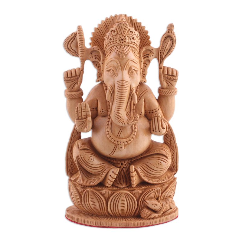 Carved from native kadam wood, this sculpture depicts Lord Ganesha, the Remover of Obstacles. One of the most beloved of the Hindu deities, Ganesha is often pictured holding his favorite dessert in one of his four hands. Another hand is raised in a blessing. Chander Kant carves the brilliantly detailed sculpture by hand.