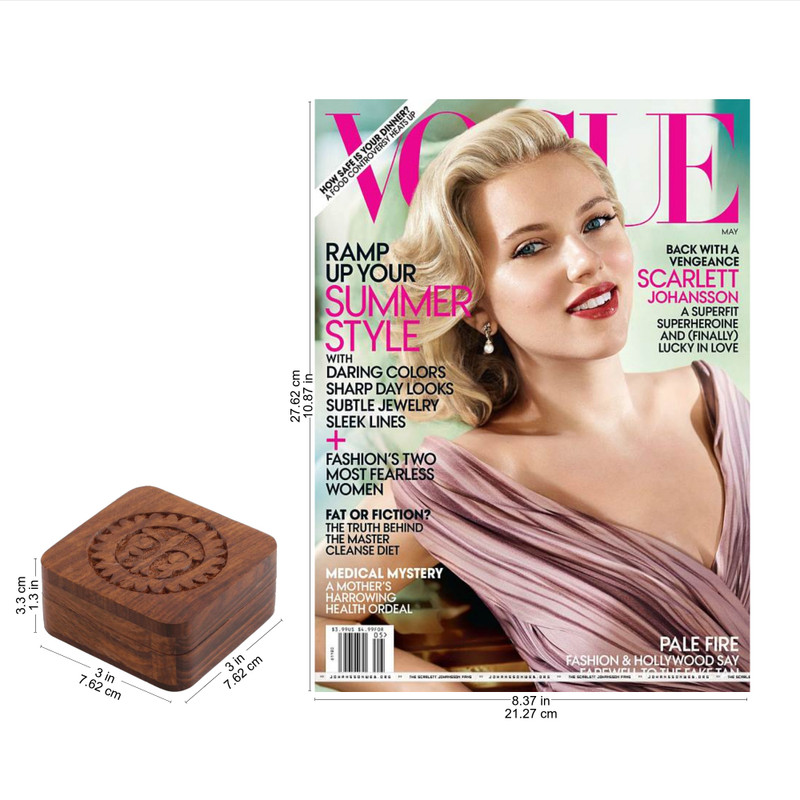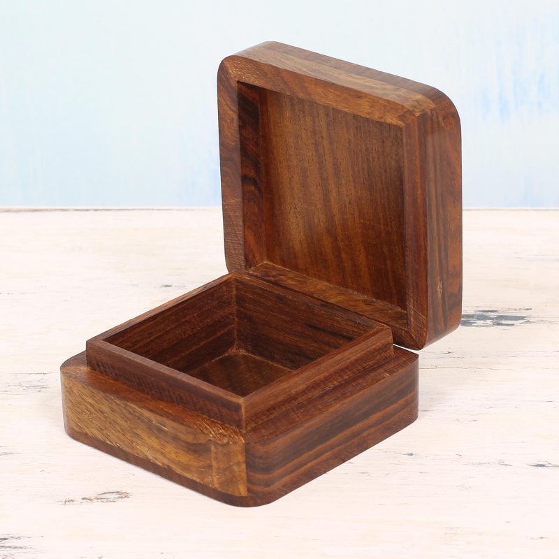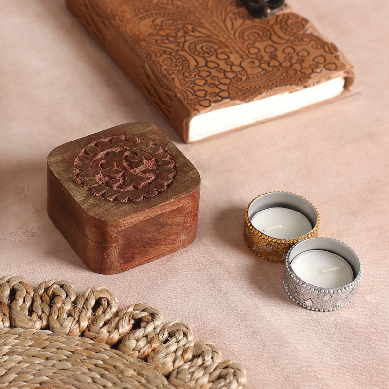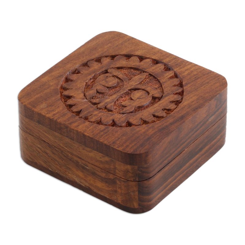 From Indian artisan Arti Sharma comes this lovely decorative box. Handcrafted out of stunning mango wood, the square box is both simple and symbolic. Carved into the lid of the box is an emblem for Surya Devta, the Hindu sun god.