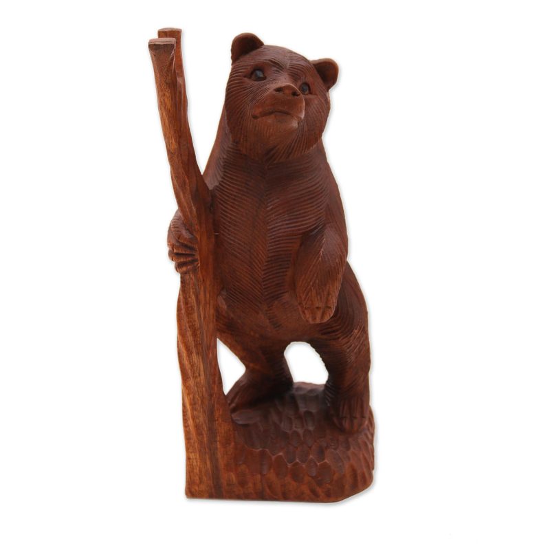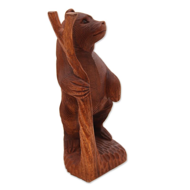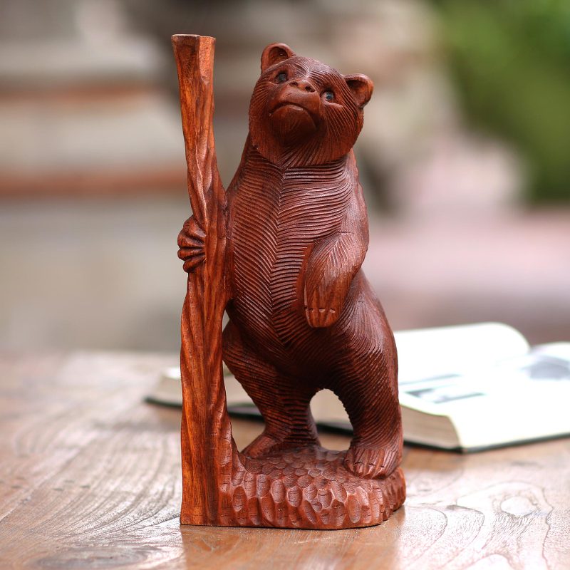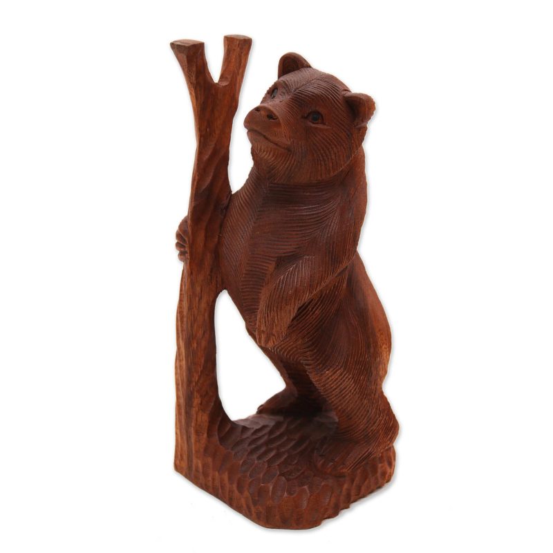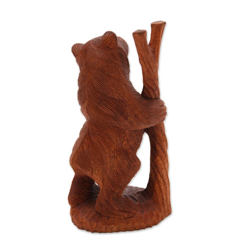 Holding onto the trunk of a tree with one paw, a cute bear lifts its head curiously. Balinese artisan Citra works with suar wood, diligently carving the furry animal by hand. This sculpture displays a truly impressive level of detail.