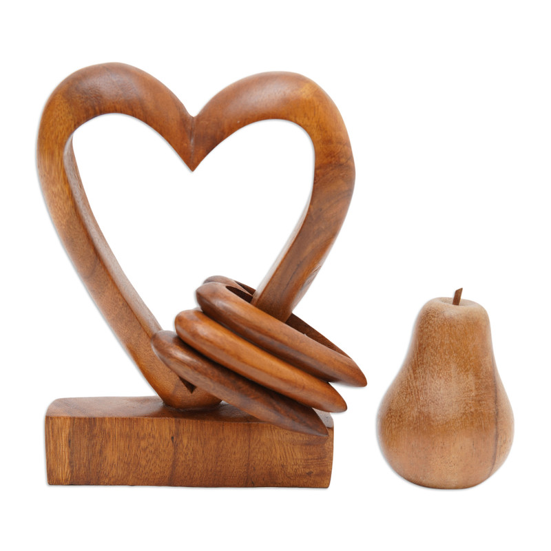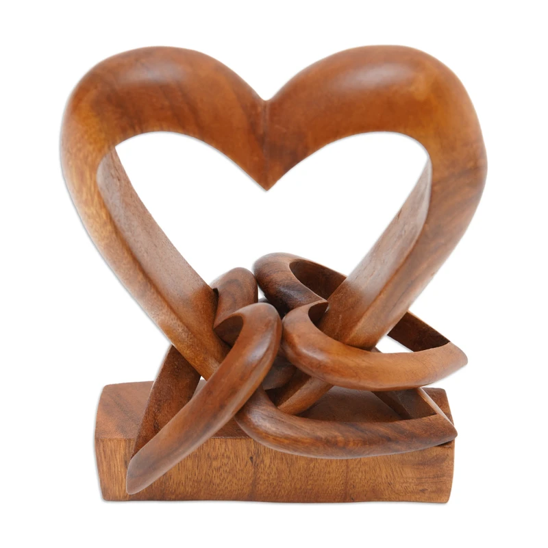 Expressing love in myriad ways, Eka designs an original sculpture. It is carved by hand from Indonesian suar wood in the shape of a voluptuous heart. Three smaller hearts are hooked within the larger one and can be moved as desired.