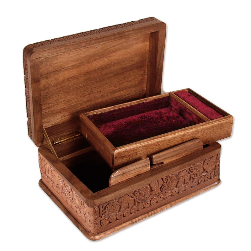 Backed by our 100% Happiness GuaranteeNestled within a florid wonderland, birds chirp warm greetings. M. Ayub designs the lavish composition, which he then carves by hand with admirable detail. The walnut wood jewelry box is lined with velvet and features a removable tray. The box also features a secret locking mechanism and can be opened by sliding the lower front panel of the box to the right side.