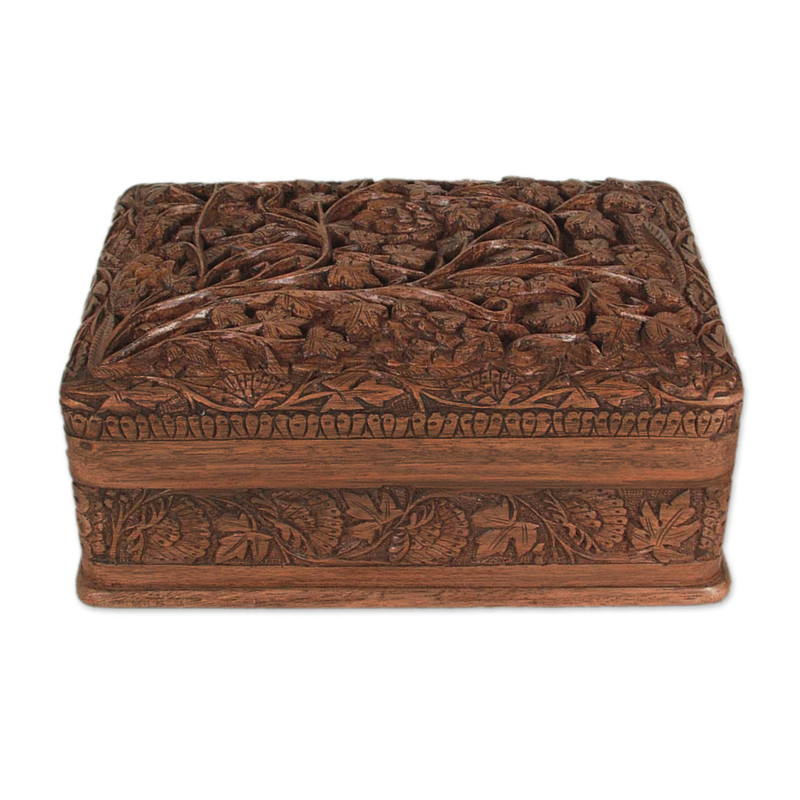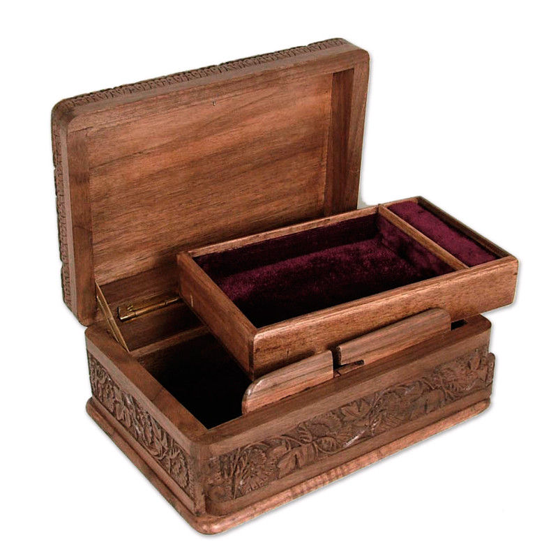 Backed by our 100% Happiness GuaranteeNestled smugly on sturdy vines, birds camouflage their feathers with leaves growing wild. They adorn a magnificent walnut wood jewelry box carved by hand by M. Ayub with sublime detail. Inside, the box is lined with velvet and features a removable tray. The box also features a secret locking mechanism and can be opened by sliding the lower front panel of the box to the right side.