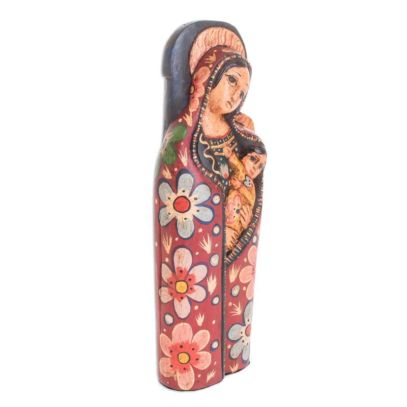 By Guatemalan duo Juan and Carolina, this statuette depicts mother Mary as she holds baby Jesus. The reverent statuette is hand-carved from pinewood, decorated with floral motifs that are painted by hand.