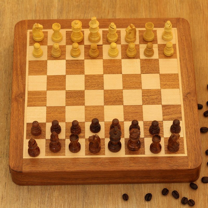 Backed by our 100% Happiness GuaranteeWile away the hours on a leisurely Sunday with this gorgeous chess set designed by Indian artisan Rakesh Pathak. The artisan crafts the set from acacia and haldu wood with a hidden, velvet-lined tray for holding the chess pieces when not in use. Each piece is equipped with a magnet on the bottom to keep them from toppling while you play.
