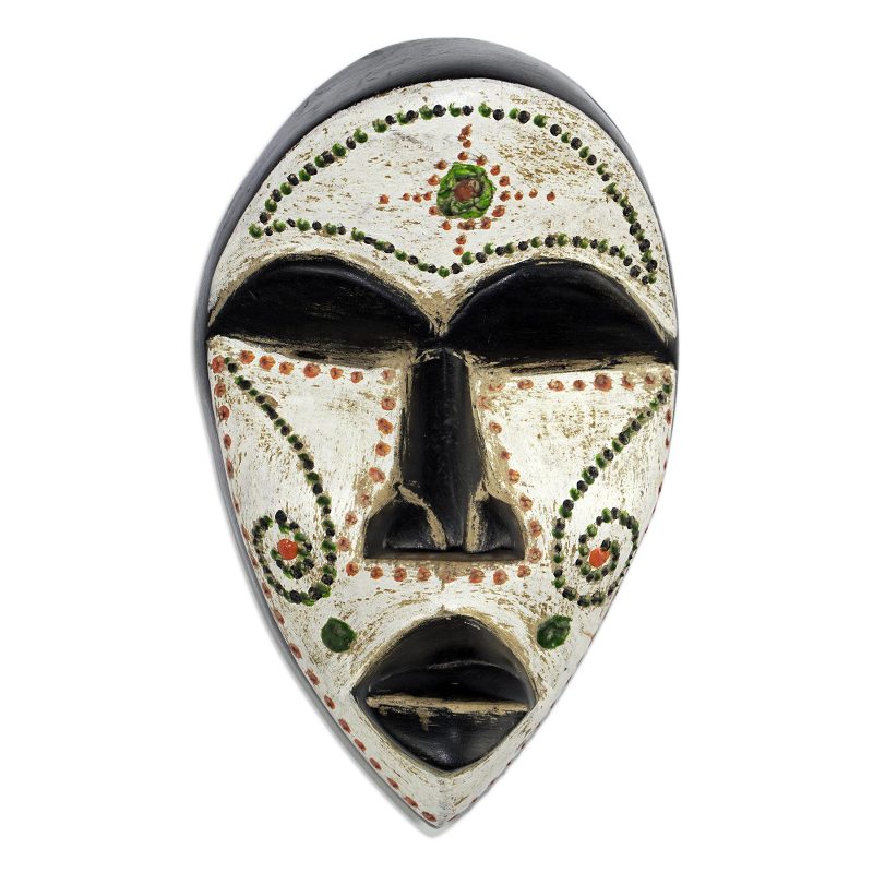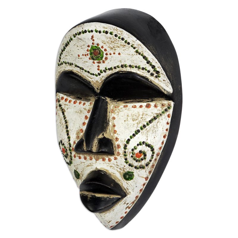 Backed by our 100% Happiness GuaranteeDesigned by Samuel Kofi Kumi in Ghana, this decorative mask honors the Dan people, of an ethnic group from the Ivory Coast and Liberia. The artisan hand carves the mask from local sese wood before painting its features black and white with curling orange and green details.