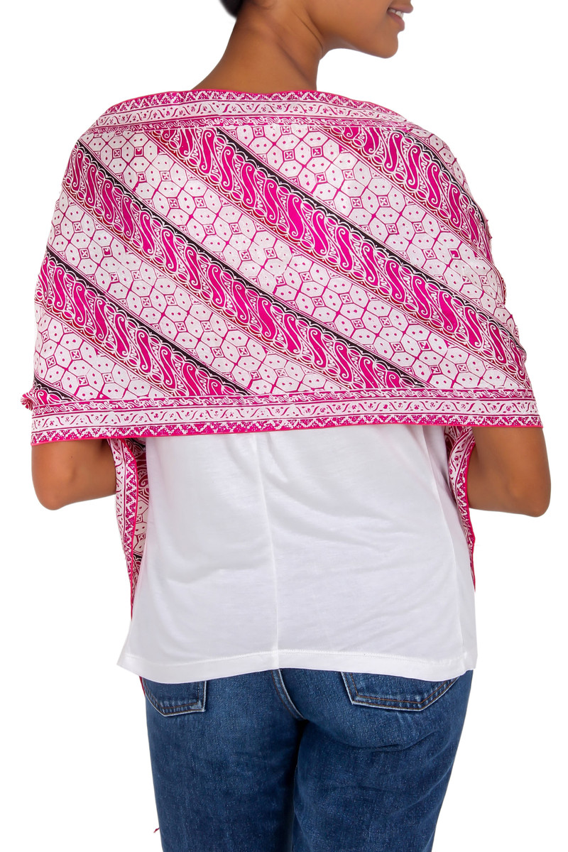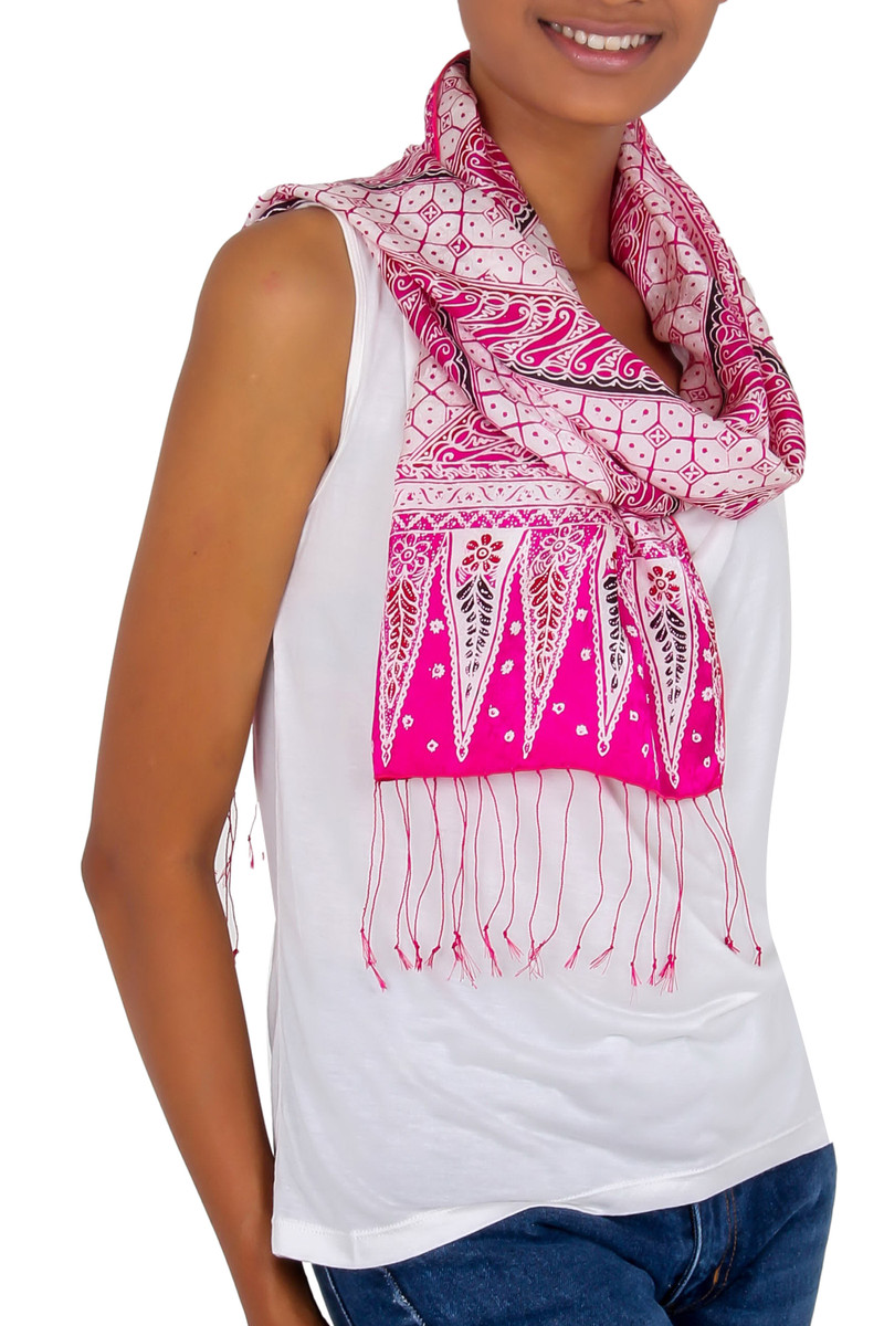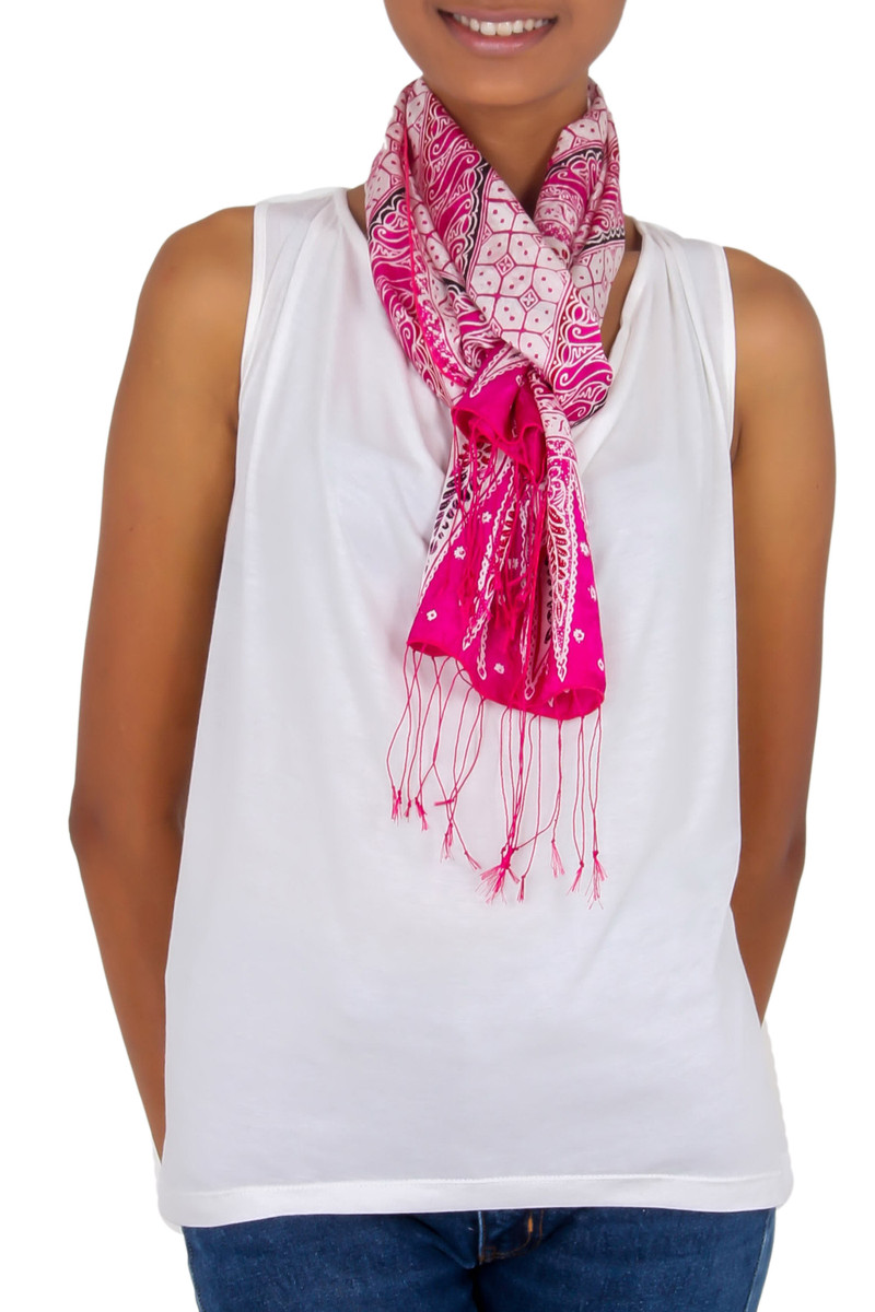 This scarf is a beautiful pink ad the batik design is lovely! Its elegant and will be a holiday gift for my daughter.