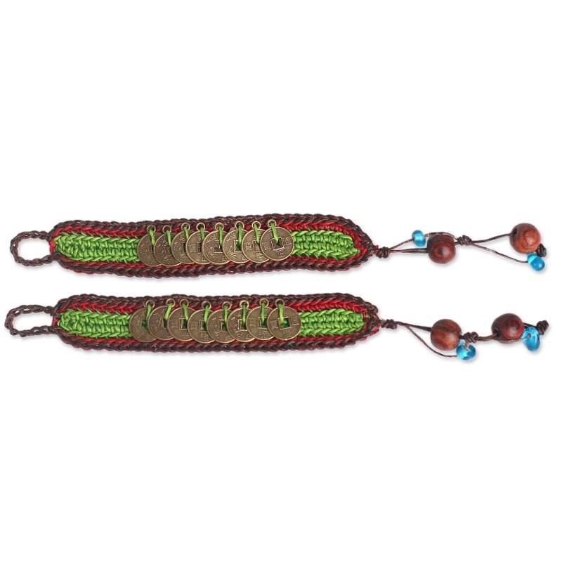 Backed by our 100% Happiness GuaranteeThai designer Tiraphan Hasub conjures mystical elegance with the design of these crocheted bracelets. She works with brass replicas of the legendary Chinese coin, believed to bring wealth and success according to Feng Shui practices. The bracelet's colorful threads are centered by green, symbol of health, harmony and nature. Hasub includes rain tree wood and glass beads for the bracelets' clasps.