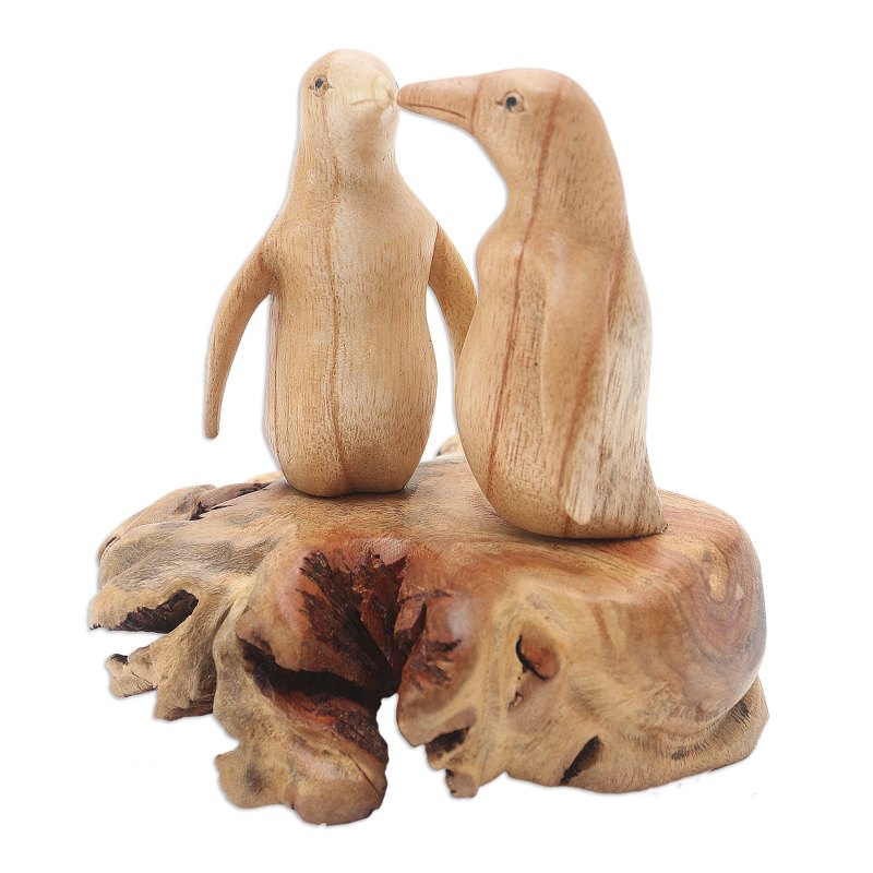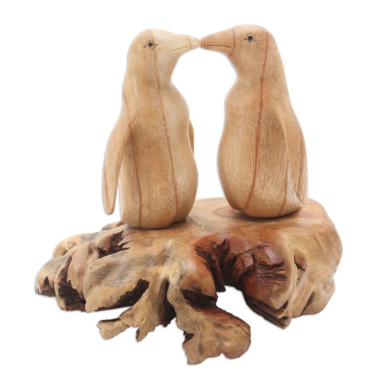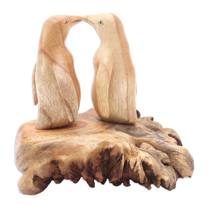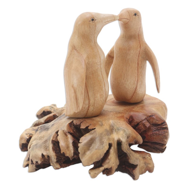 Clearly in love, the penguins on Yudi Suardi's charming statuette give each other affectionate kisses. Hand carved from natural jempinis wood, the penguins levitate on a base of benalu, or parasite wood. Please note the base may vary in shape and size, as the artisan uses found benalu wood pieces to create this sculpture.