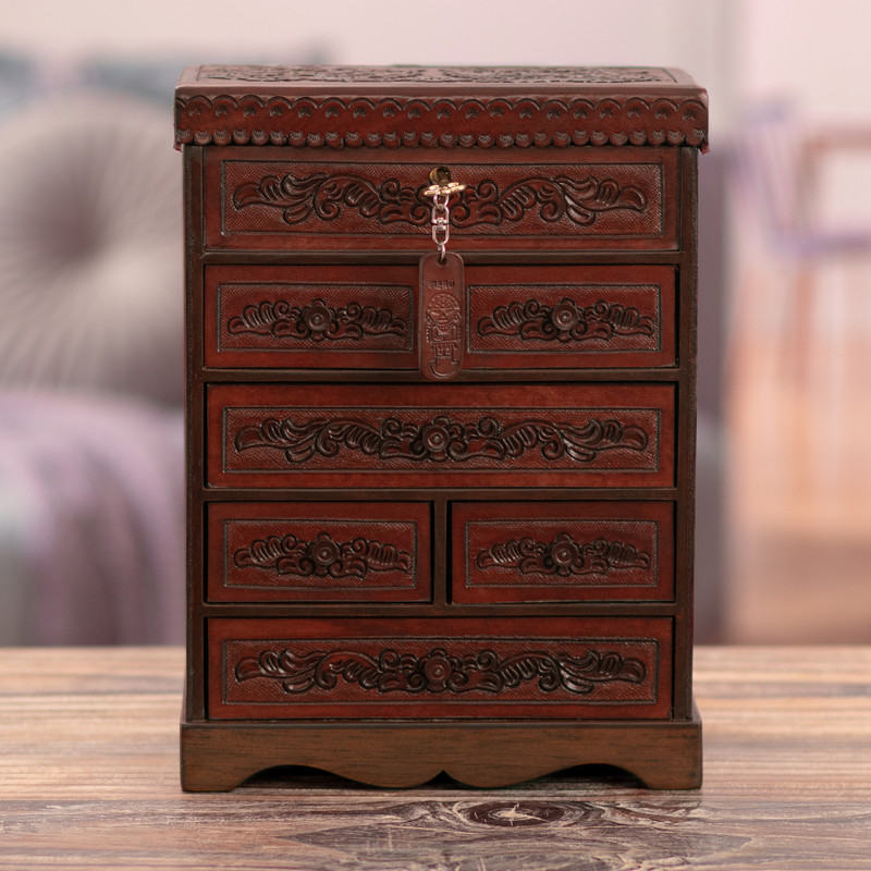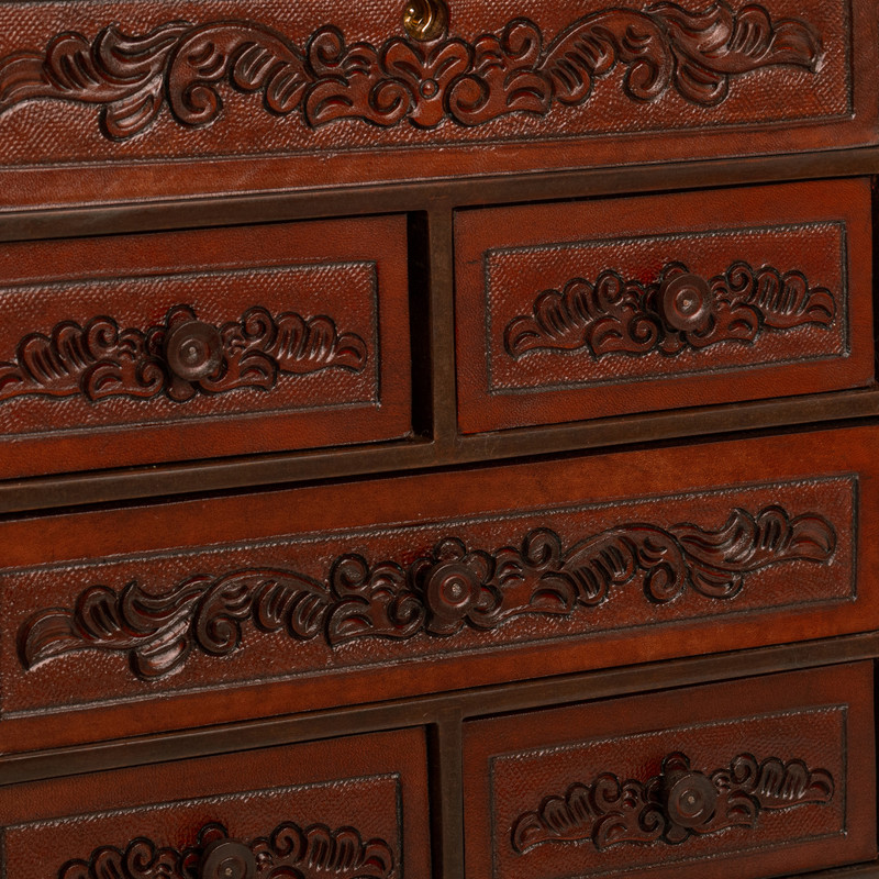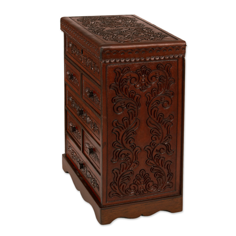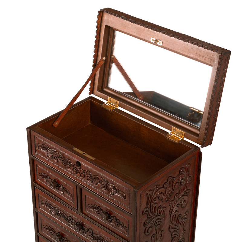 Backed by our 100% Happiness GuaranteeThis simply gorgeous jewelry chest is the creation of Peru's Julio Sanchez. The tall chest is crafted from wood and covered with hand-embossed leather in a rich dark brown shade. Perfect for organizing a jewelry collection, the chest features a mirrored top compartment and six removable drawers.