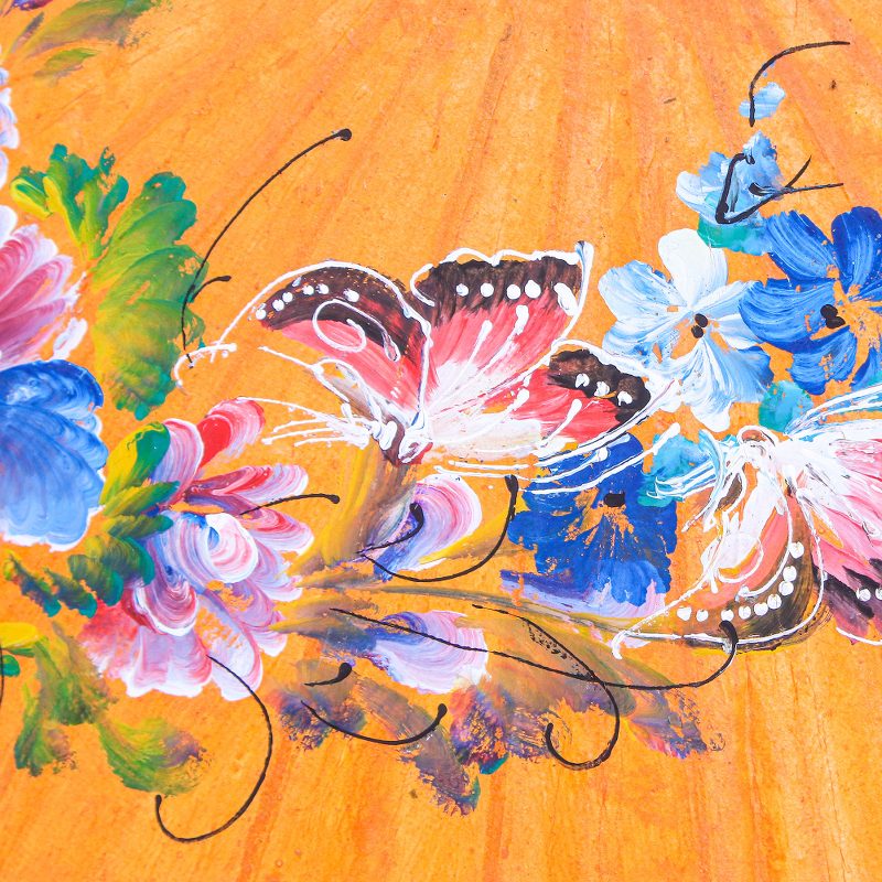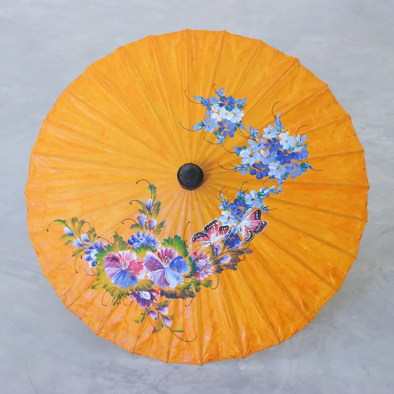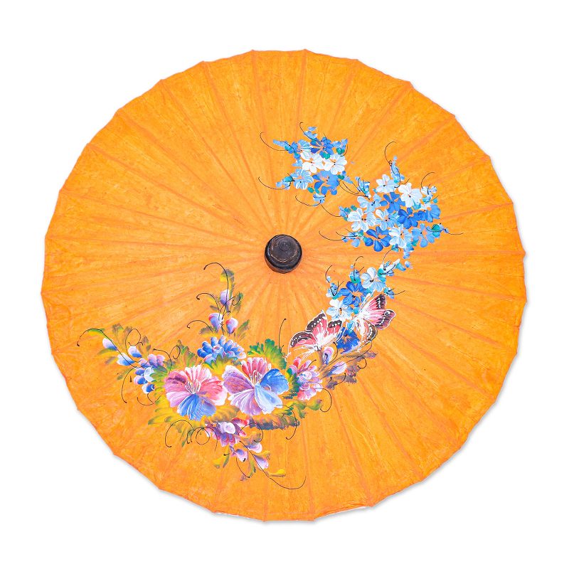 Nikom uses saa paper, from the bark of the mulberry tree, and bamboo to craft this dainty parasol in bright tiger-lily orange. Inspired by the local flora and fauna of their native Thailand, artisans adorn the parasol with hand-painted blossoms and butterflies in oil paint. The parasol is perfect for casual use or as home decor.