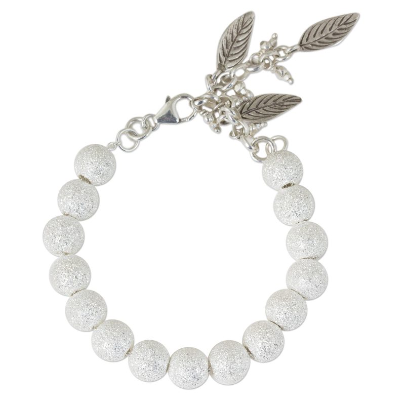Leaf charms, meticulously crafted from high quality silver, dangle daintily from this radiant beaded bracelet. Withaya Cheunjit of Thailand presents this bracelet featuring round beads of shimmering silver with a stippled texture and an extender chain for adjustable length.