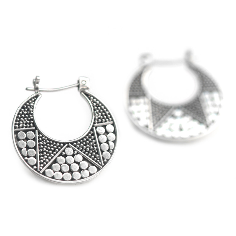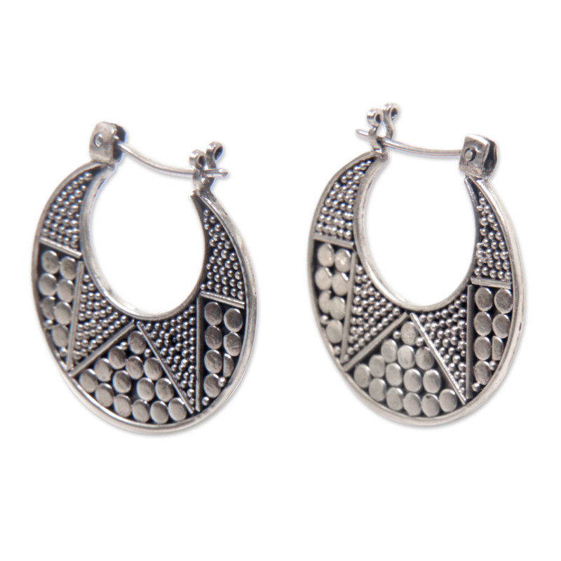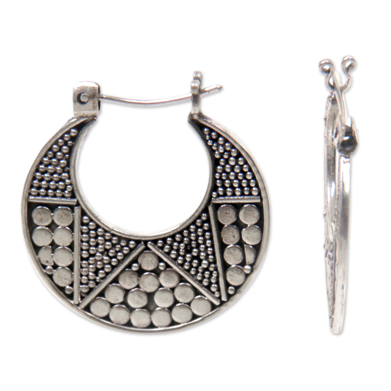 Kenari designs earrings rich in Balinese artistry. The sterling silver hoop earrings are crafted by hand featuring dotted details on one side, and a polished finish on the other side.