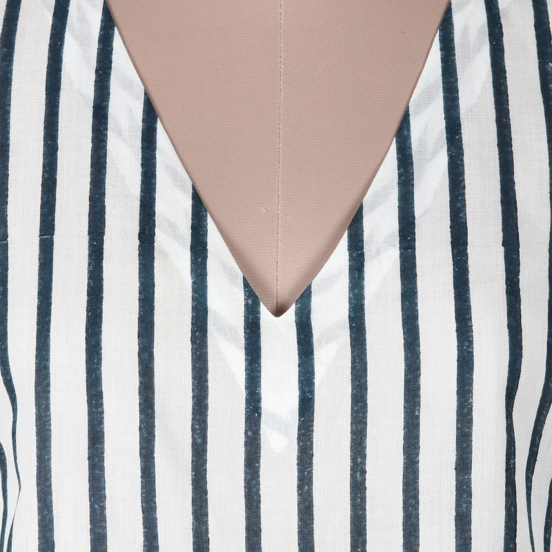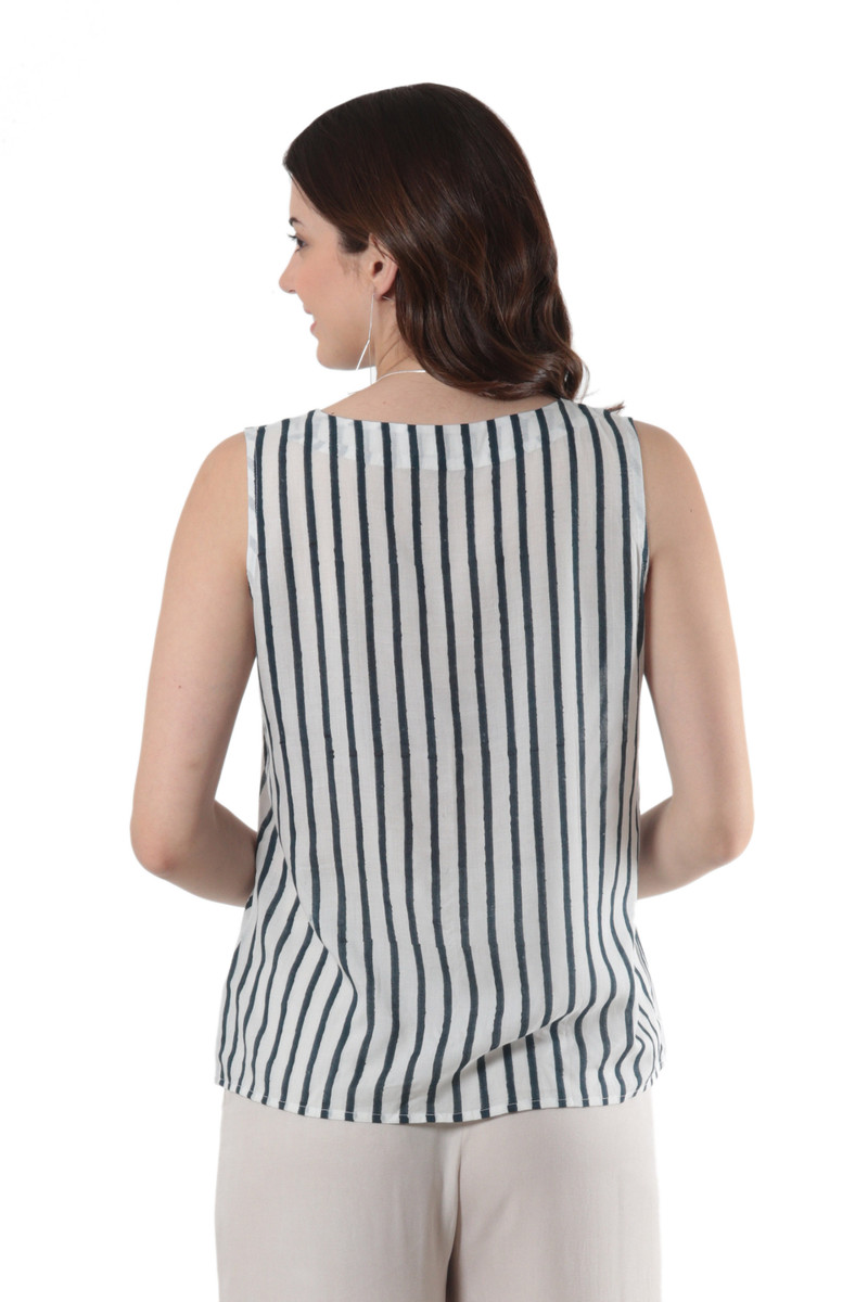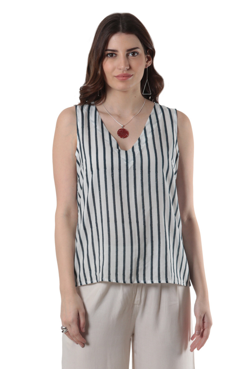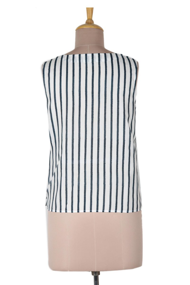 Keep cool on hot summer days with this impossibly chic sleeveless blouse designed by Indian artisan Ritu Agnihotri. Hand crafted from soft, breathable viscose, the top features a vertical stripe pattern that's hand block-printed in navy and white. A v-shaped neckline adds an elegant yet saucy touch.