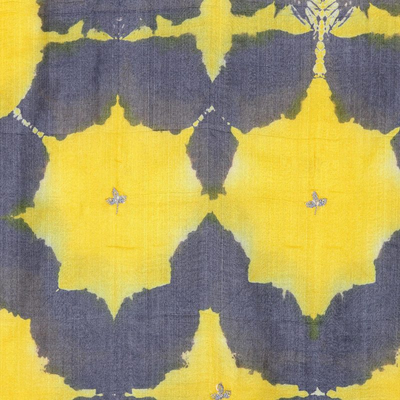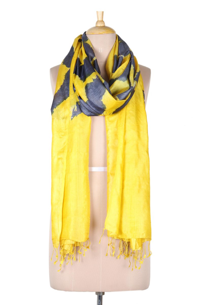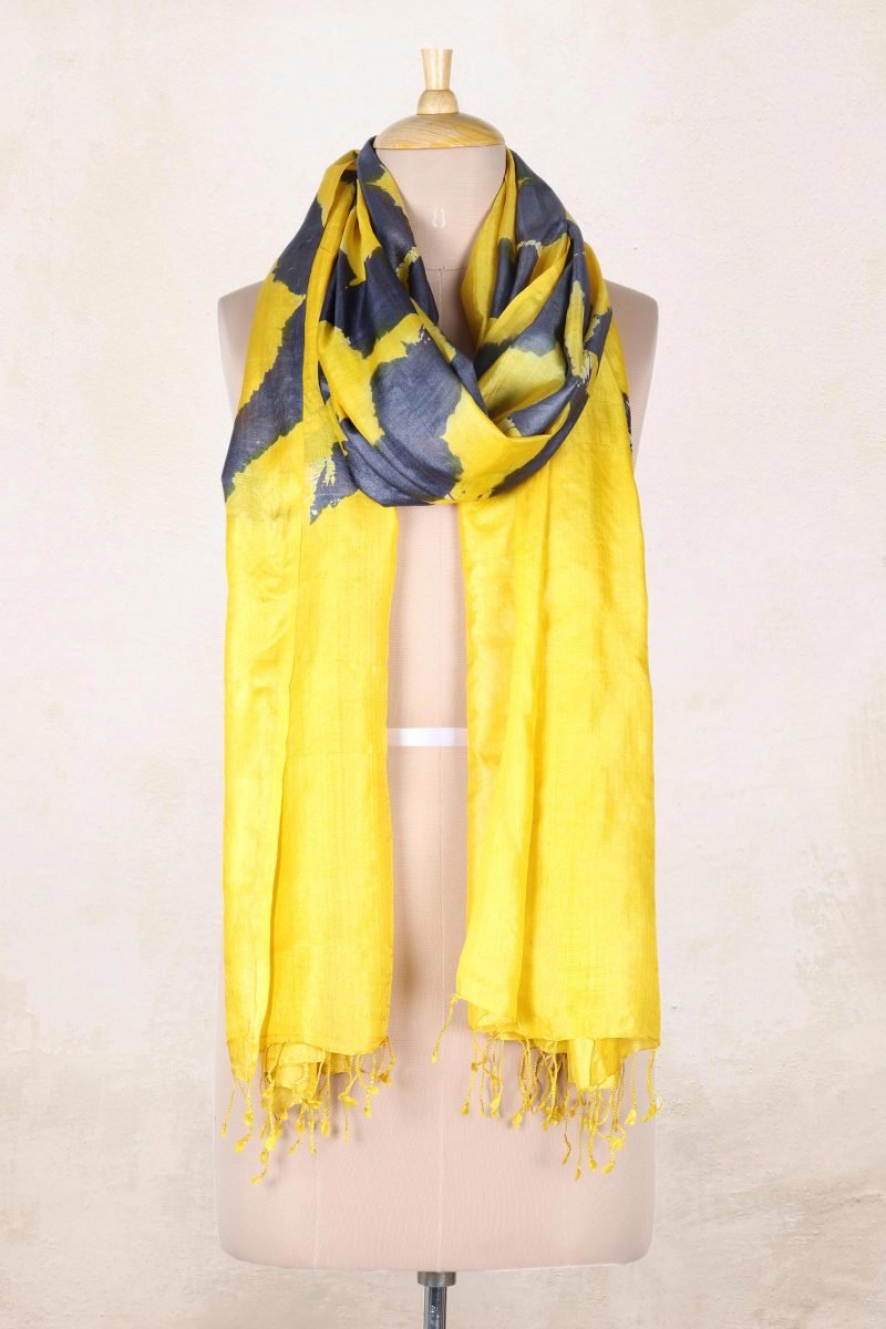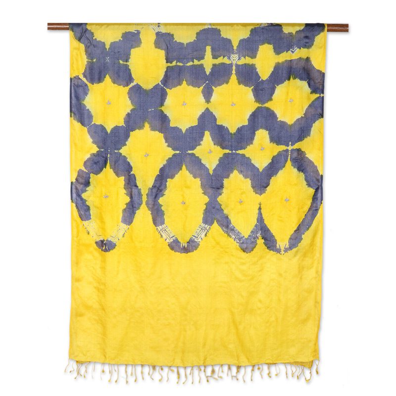 Wrap yourself in rich Indian silk with this chic tie-dyed shawl presented by Khitish. Crafted from 100% silk, the shawl features a leaf motif tie-dyed pattern in steel blue on a bright yellow base. With a supremely soft texture that drapes beautifully and a fun row of fringe at both ends, the scarf is sure to become your new favorite accessory.