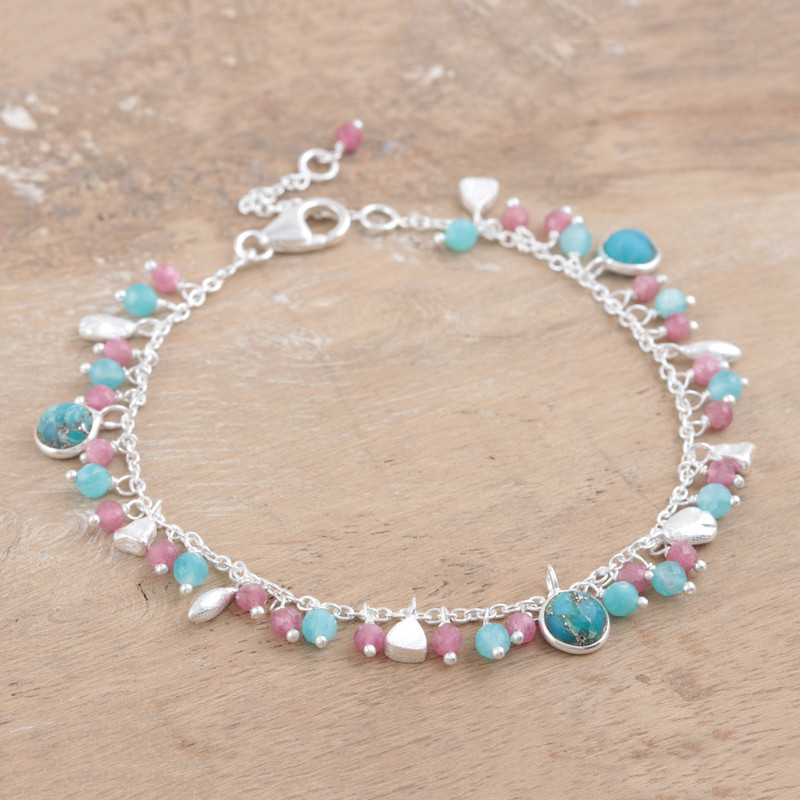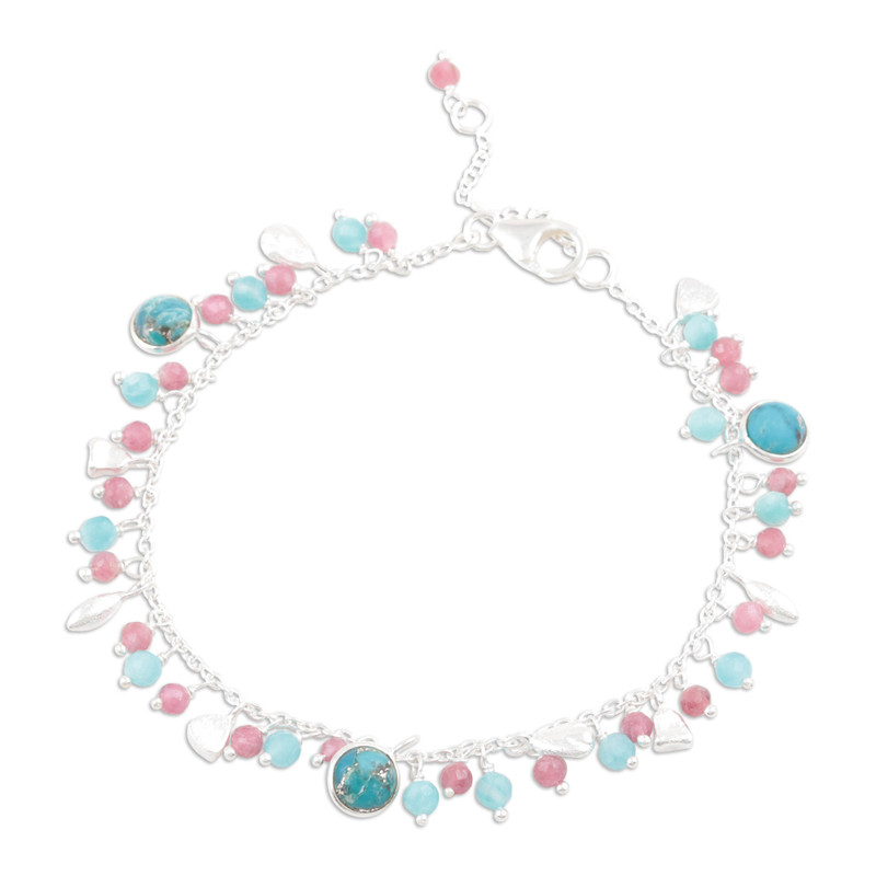Backed by our 100% Happiness GuaranteeEmbellished with pink and teal stones, Neetu Barathi's silver charm bracelet seduces with soft, inviting colors. Indian artisans use sterling silver to hand craft the bracelet, accenting its slender cable chain with chalcedony and tourmaline beads alongside reconstituted turquoise.