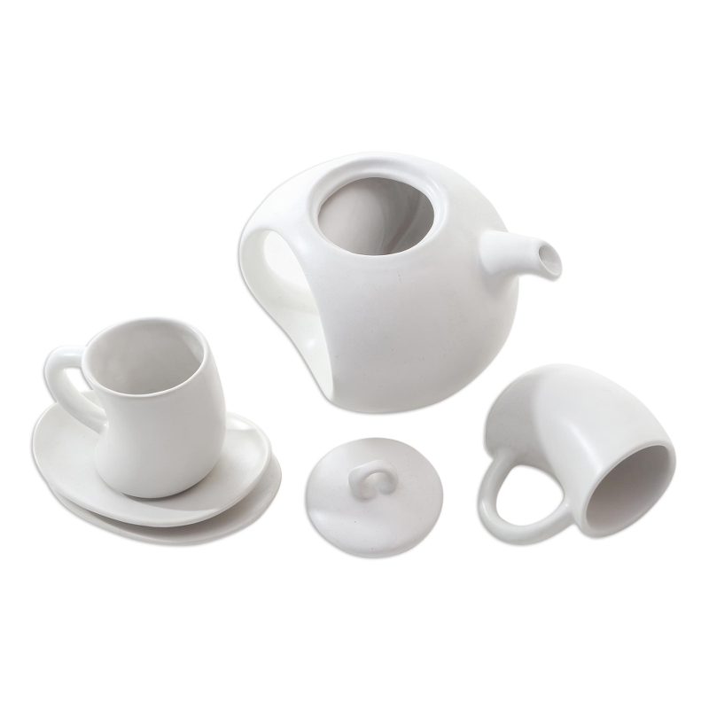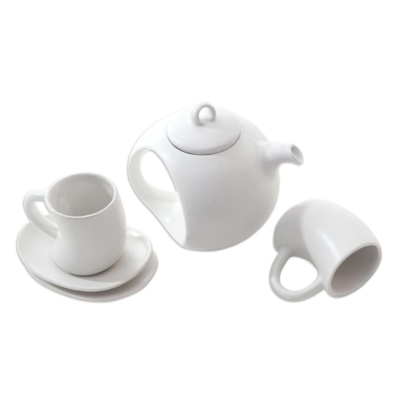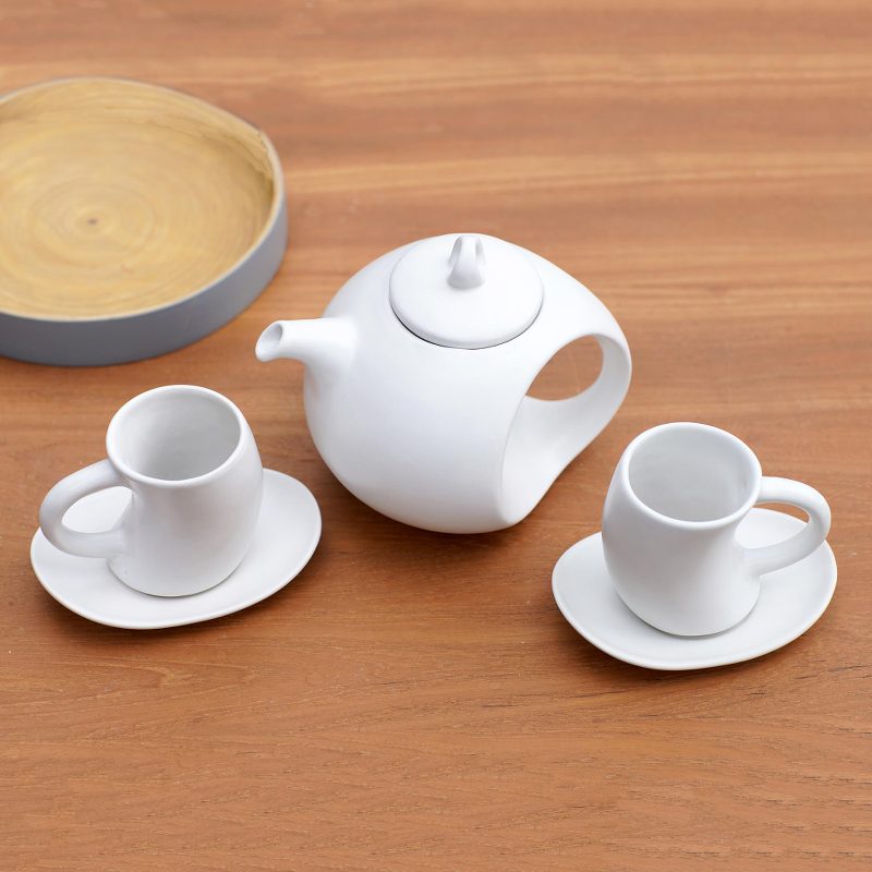 Backed by our 100% Happiness GuaranteeYou'll be itching to pour your next cup of tea using Nyoman Suarmini's darling teapot and cup set. The Balinese artisan crafts the pot, two cups, and two matching saucers from smooth, white ceramic, which is shaped by hand to achieve the set's unique slanted design.