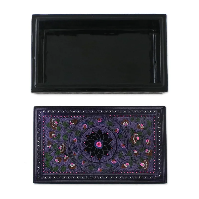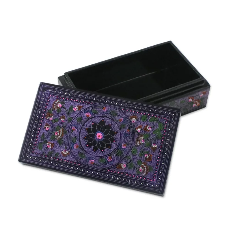 A dazzling array of diminutive flowers blooms in splendid abandon on sleek black lacquer. It showcases Nantana Sompamitre's art. She carves mango wood into the desired shape and coats it with lacquer. Once dried it is polished, and another coat is applied – up to twenty times – before as many six coats of pure lacquer are present. The final layer is polished with powdered fired clay. The piece is painted by hand, and brass rings protect the openings.