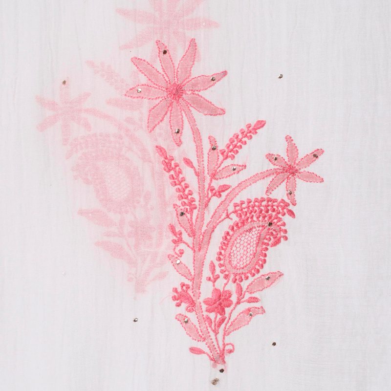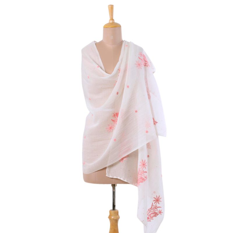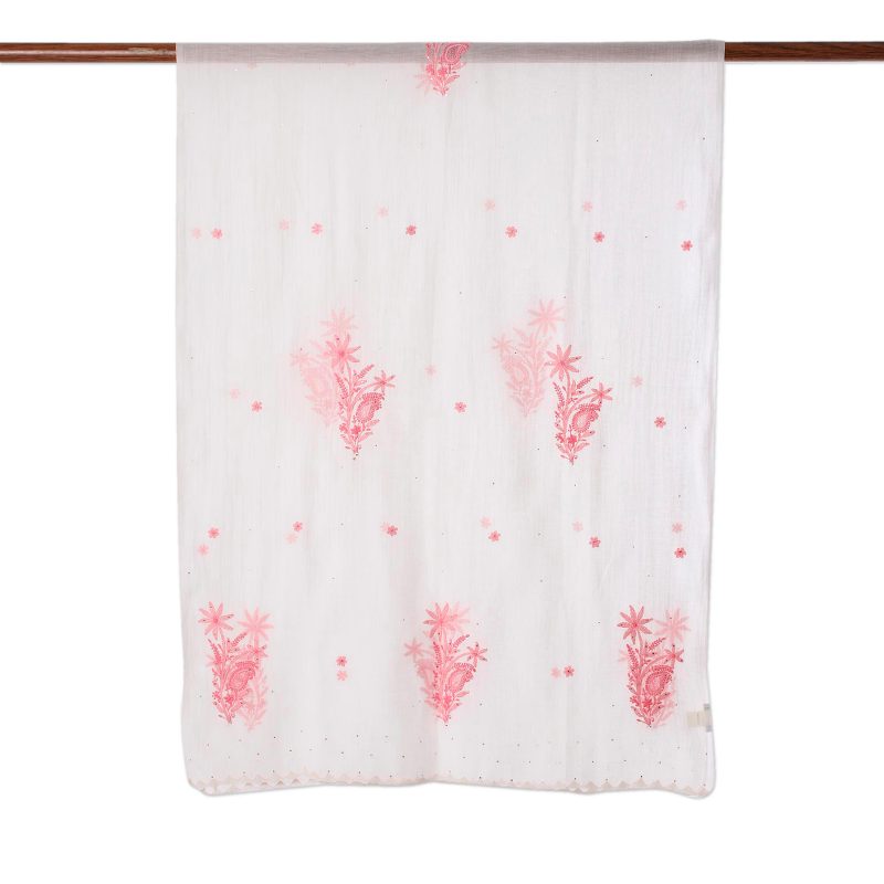 This graceful cotton-silk blend shawl is designed by Uma Tripathi and is hand-embroidered with traditional Indian chikankari work, where patterns are block-printed onto fabric to use as a guide for the hand-embroidery. The shawl's natural ivory color is accented with light pink jali paisley, floral blooms and leaves, and tiny metallic details throughout the entire panel. The ends of the shawl are neatly stitched with ivory rayon thread, employing another traditional embroidery style, kamdani, displaying triangle motifs that evoke hills.