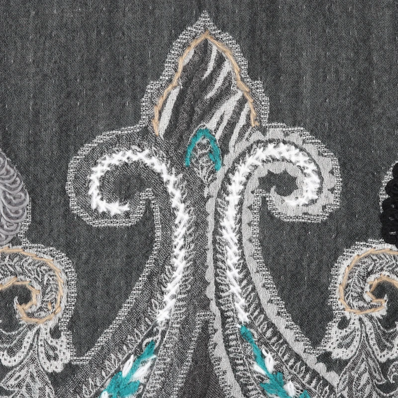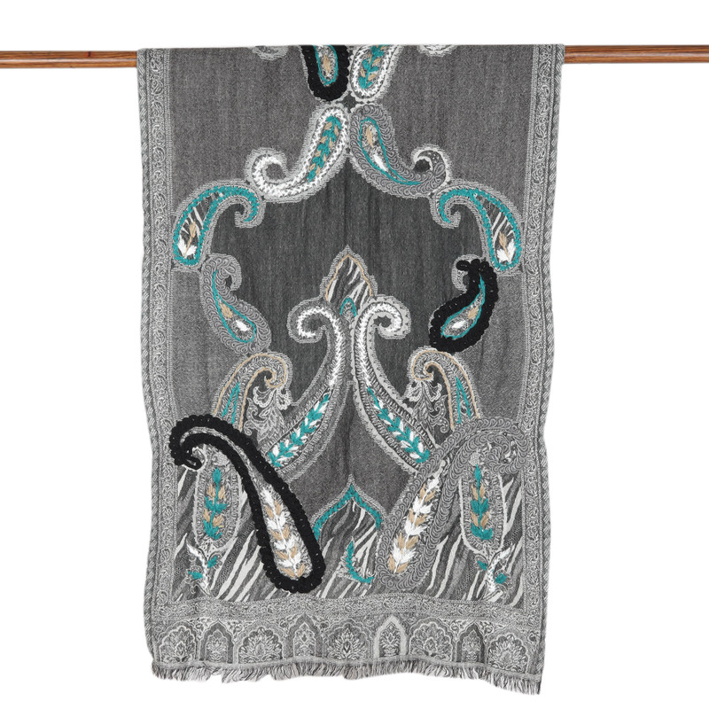 Backed by our Happiness GuaranteeIndian artisan Shahid draws inspiration from the breathtaking textiles of his beloved culture to create a stunning shawl in a palette of dark hues. Featuring embroidered details forming paisley motifs, the piece is also enhanced by little Caribbean blue hues for a refreshing aura.