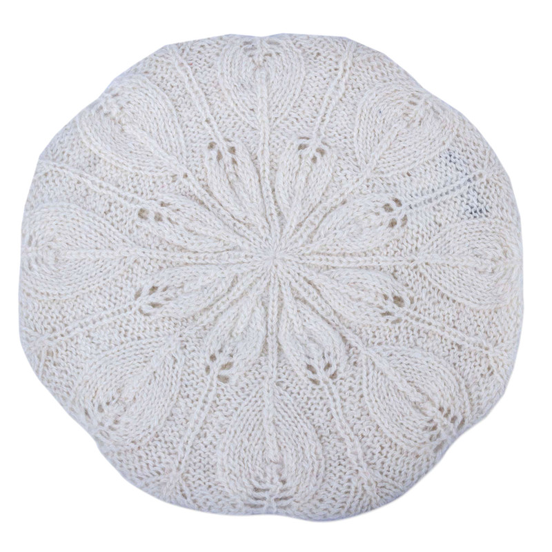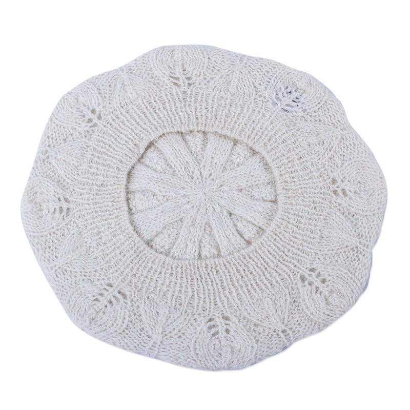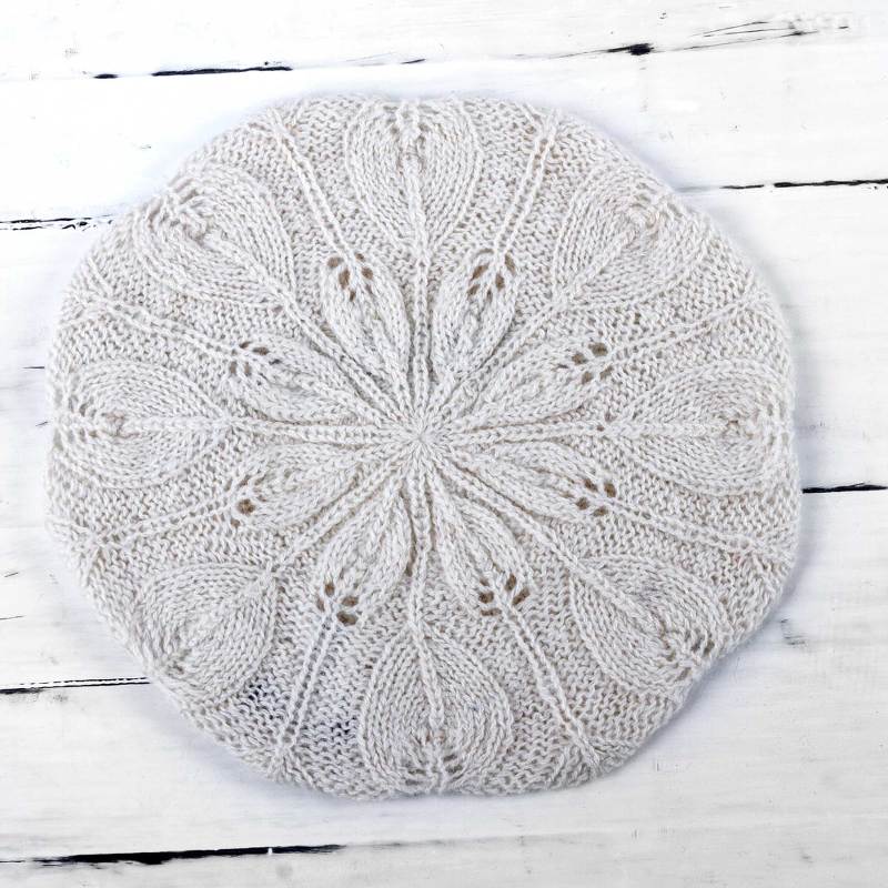 Warm and stylish, this cozy alpaca wool beret is the perfect pairing for any winter outfit. The ivory hat is lightweight yet warm and features hand knit patterns of buds and leaves.