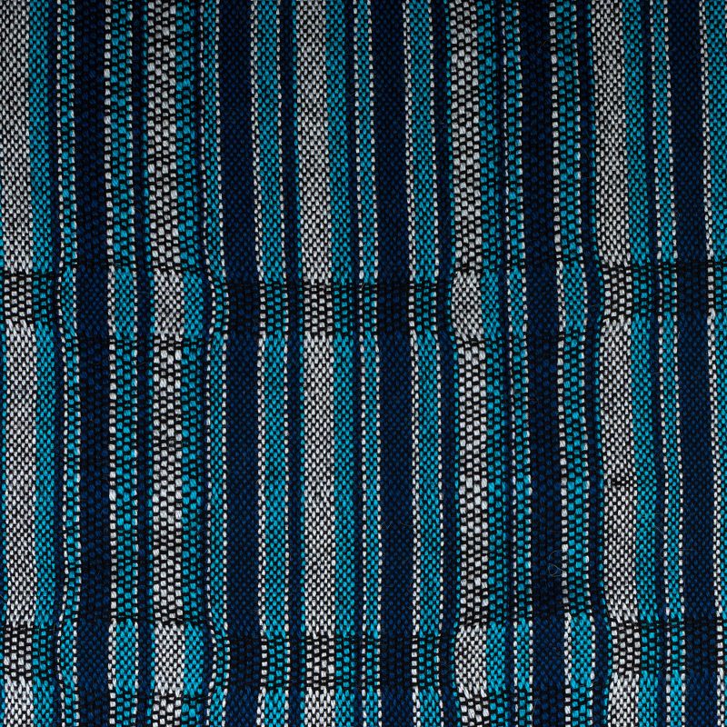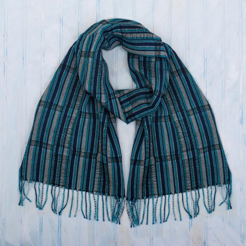 Luxuriously soft, this beautiful unisex scarf is crafted from 100% baby alpaca, the premium fleece from the first shearing of the season. Peru's Wilmer Vilchez designs the scarf, which is woven on a traditional loom in shades of cyan, navy, black and white.