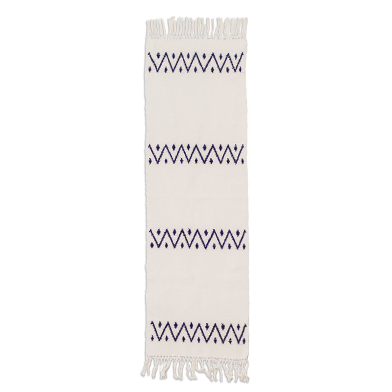 This handwoven cotton table runner in ivory and blue offers a perfect blend of elegance and texture. With its eye-catching geometric patterns and delicate fringe trimming, it adds a refined touch to your dining space. Created by Miriam and Debora of Guatemala, it brings a sense of warmth and understated beauty to any table setting.
