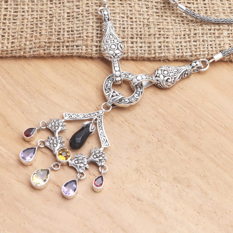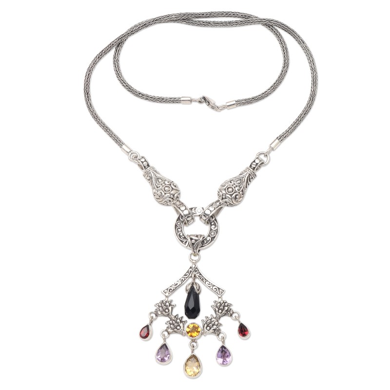 A rainbow of colorful gemstones shines on this gorgeous pendant necklace designed by Bali's Dewi Putera. A black onyx briolette centers the pendant, while pear-shaped garnet, citrine, and amethyst gemstones dangle from the pendant's sterling silver floral motif.
