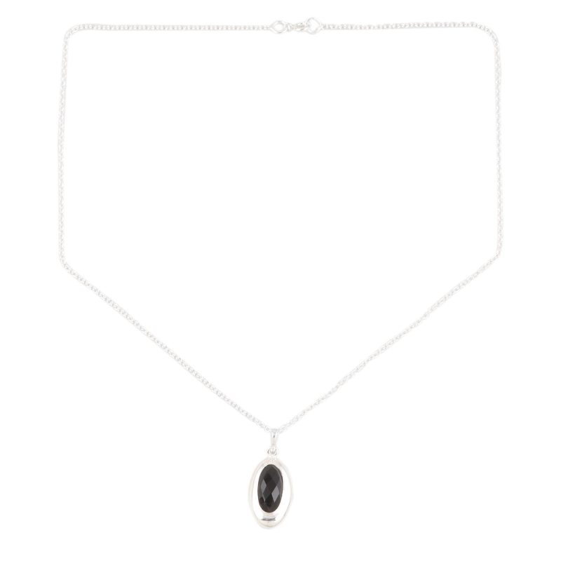 Backed by our 100% Happiness GuaranteeFramed in silver, the glittering black gemstone on Ajay Patil's pendant necklace sparkles in the light. Indian artisans use sterling silver to hand craft the necklace, centering the pendant with faceted black onyx. Suspended from a sterling silver rolo chain, the necklace is a wonderful example of Indian silversmithing.
