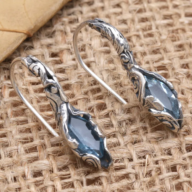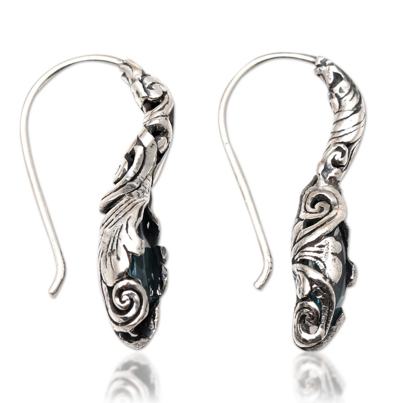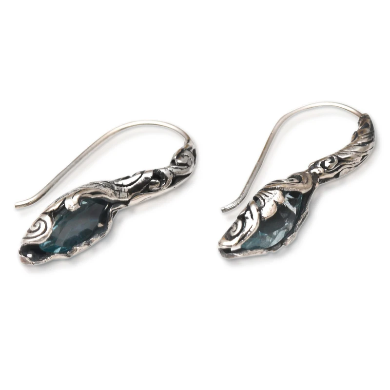 Backed by our 100% Happiness GuaranteeSparkling blue gems peek out from cool silver settings on Ni Wayan Astiti's uniquely designed drop earrings. The Balinese artisan centers each earrings with a faceted blue topaz gem which emerges from a cocoon-like guard setting. Sterling silver designs in an oxidized finish complete the pair with subtle details.