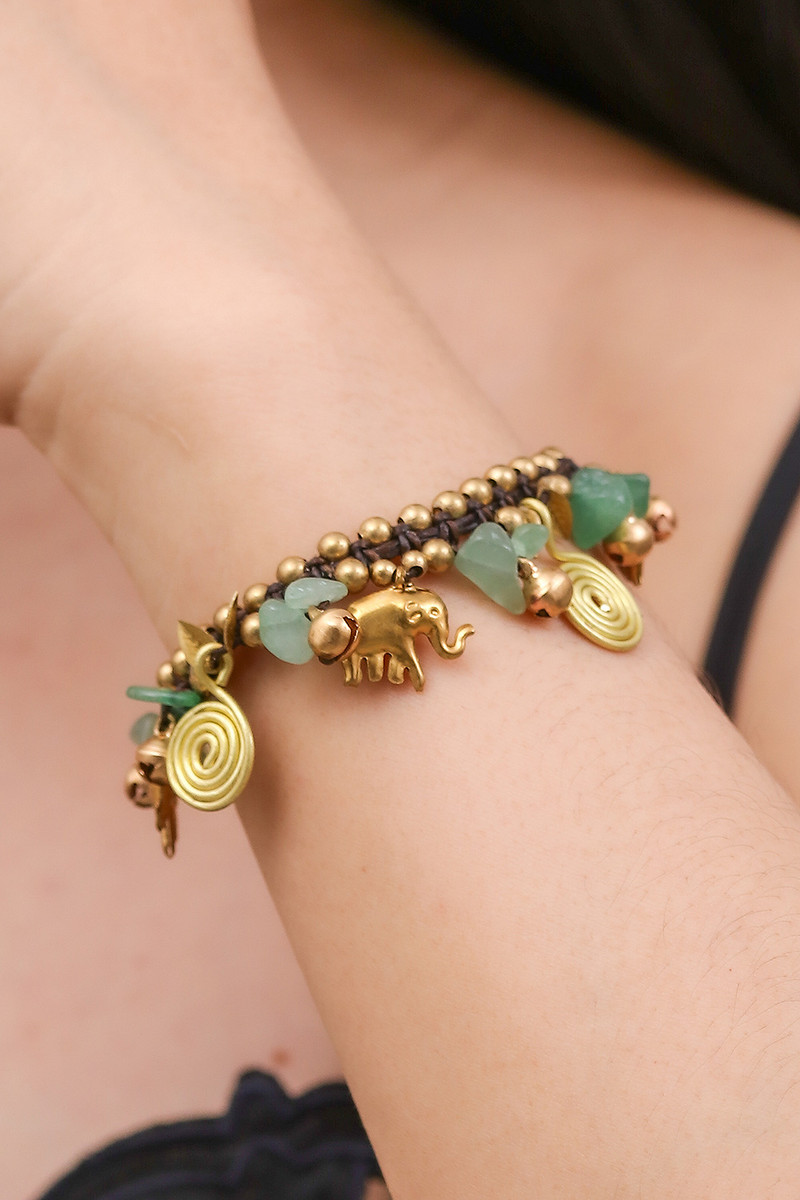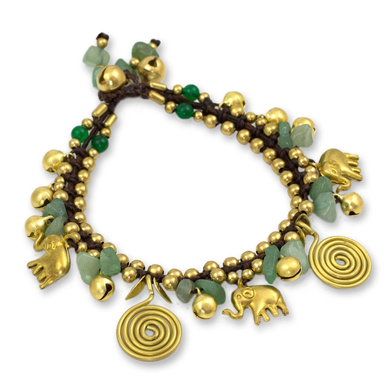 Backed by our 100% Happiness GuaranteeTiraphan Hasub captures the charm of old Siam with the design of this bracelet featuring golden elephants. Accompanied by spirals and ringing bells, the brass charms alternate with aventurine. The brown braided bracelet can fasten at one of two lengths, flanked by beads of dyed green quartz.