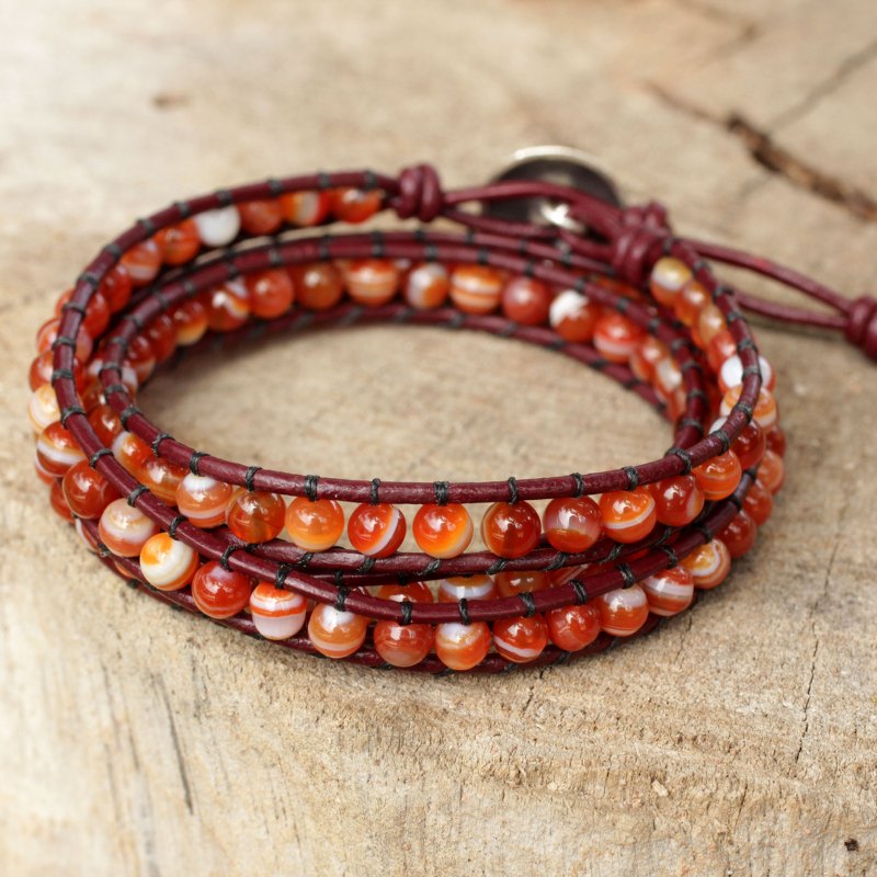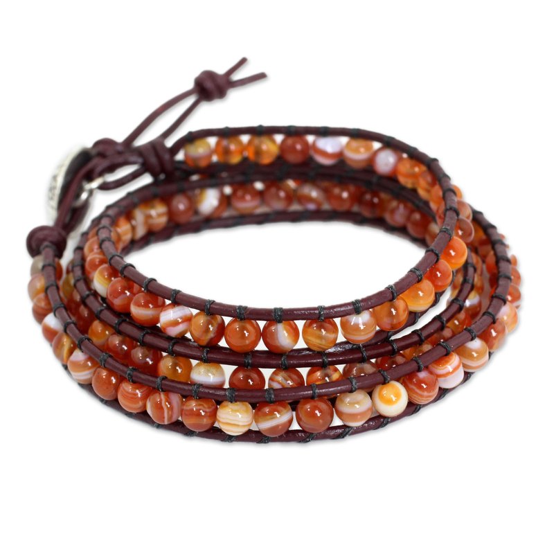 A silver flower blossoms in the Thai forest. By Siriporn, this design wraps three times around the wrist. The bracelet features bright carnelian, which represents the July birthstone, and a black agate bead, knotted by hand on leather cords.