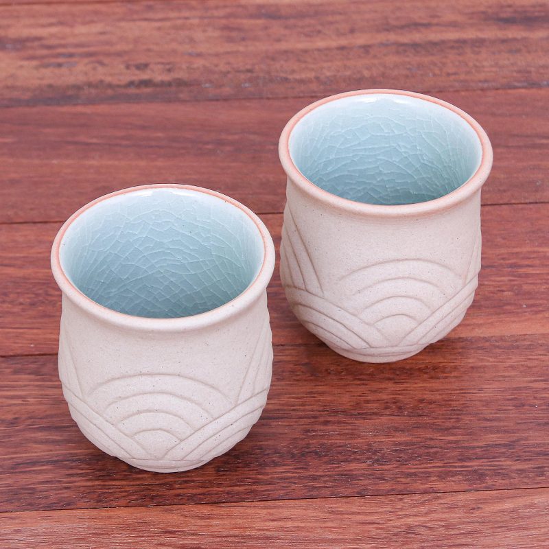 The next time you feel stressed, try enjoying a lovely cup of chamomile tea with a friend using this set of cups designed by Thai artisan Penpan. Hand crafted from ceramic, the cups feature a soothing wave pattern on an unglazed base. The inside is glazed in light green celadon for an interesting contrast.