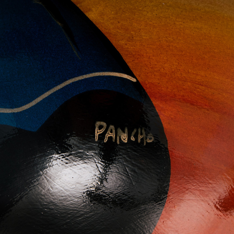 Women sit outside a monastery, their traditional garments flashing vivid colors and brilliant geometric. Francisco Guerreros uses passionate red along with black and bright yellow to create a harmonious dance of color on this brilliant ceramic vase.