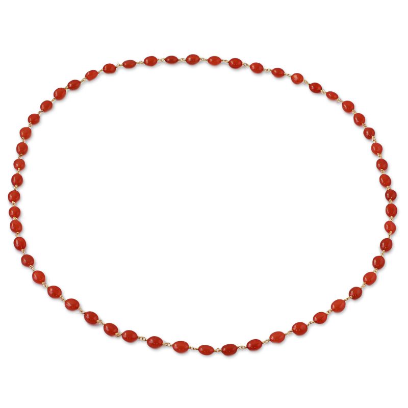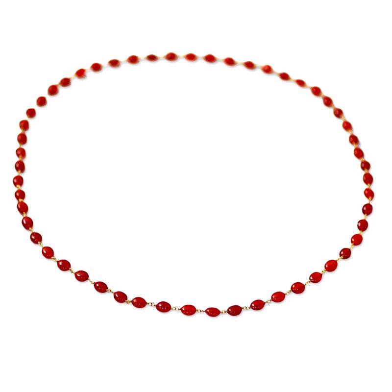 Bhavesh from India is proud to present this sumptuous beaded strand necklace. Stones of carnelian glow with red-orange hues along the length of this long necklace, which features a handcrafted design from 23k gold plated sterling silver.