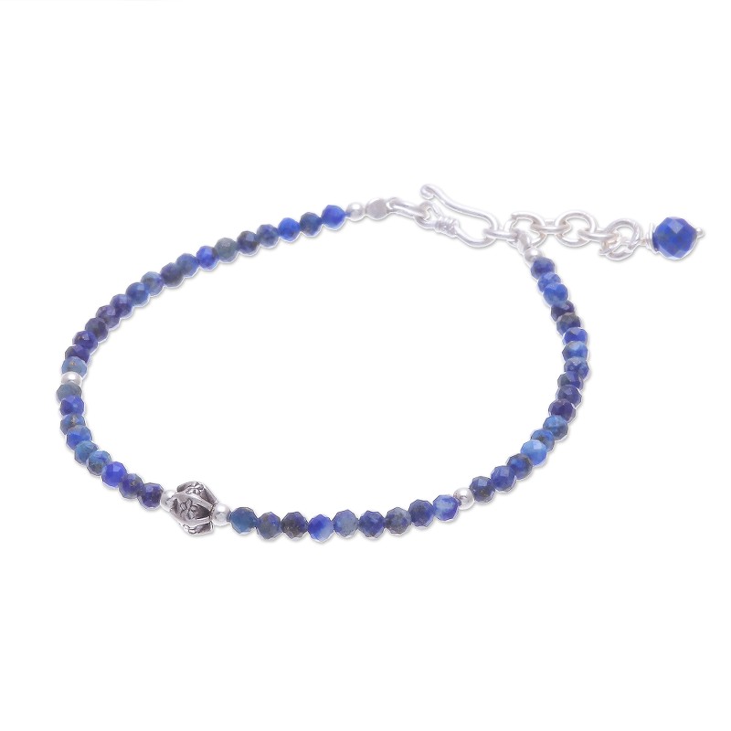 A row of tiny lapis lazuli gemstones dazzle in this alluring bracelet designed and crafted by Thai artisan Samart Takham. The artisan hand threads round, faceted lapis lazuli beads to create the bracelet, adding a single 950 Karen silver pleated bead at the center. The bracelet is finished with a 950 silver hook clasp and extender chain adorned with an additional lapis lazuli bead.
