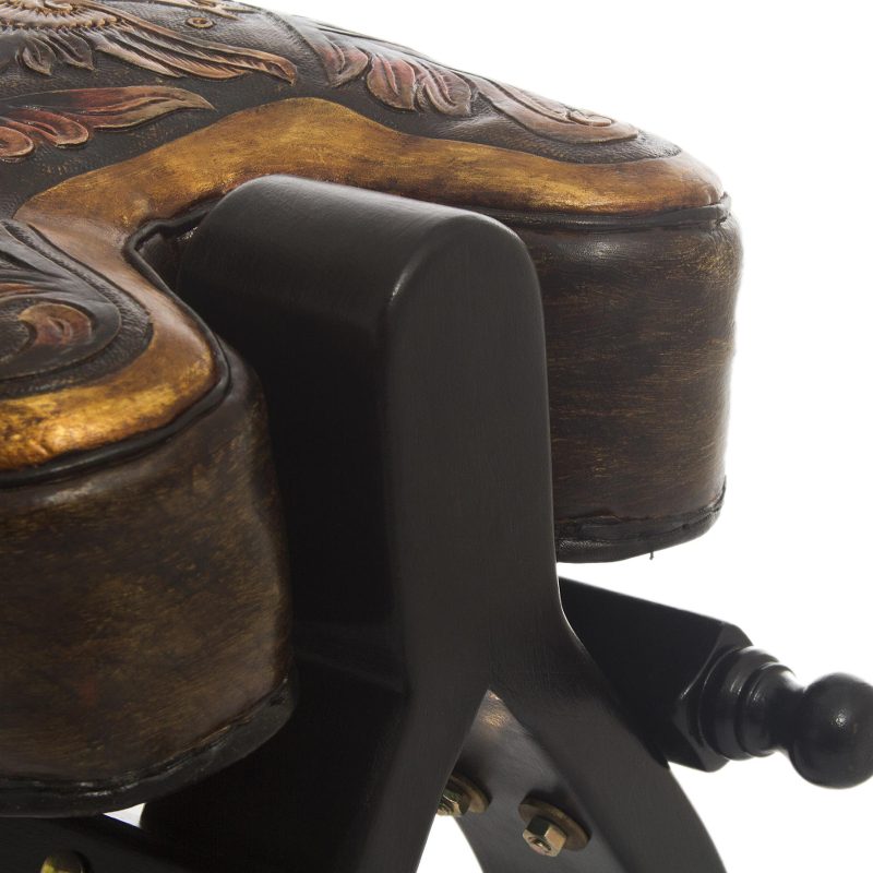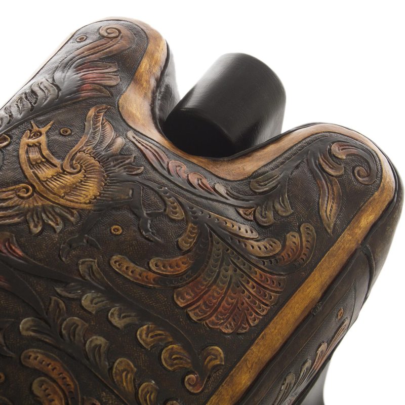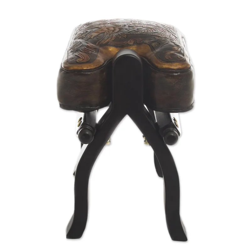With its novel form of a vaulting horse, this handsome stool is beautiful and original. Abel Ríos skillfully combines form and function, creating an unusual, handcrafted piece of furniture. The soft seat of glowing leather is hand-tooled with bird of paradise motifs and is mounted on a frame of mohena wood, similar in grain to mahogany.