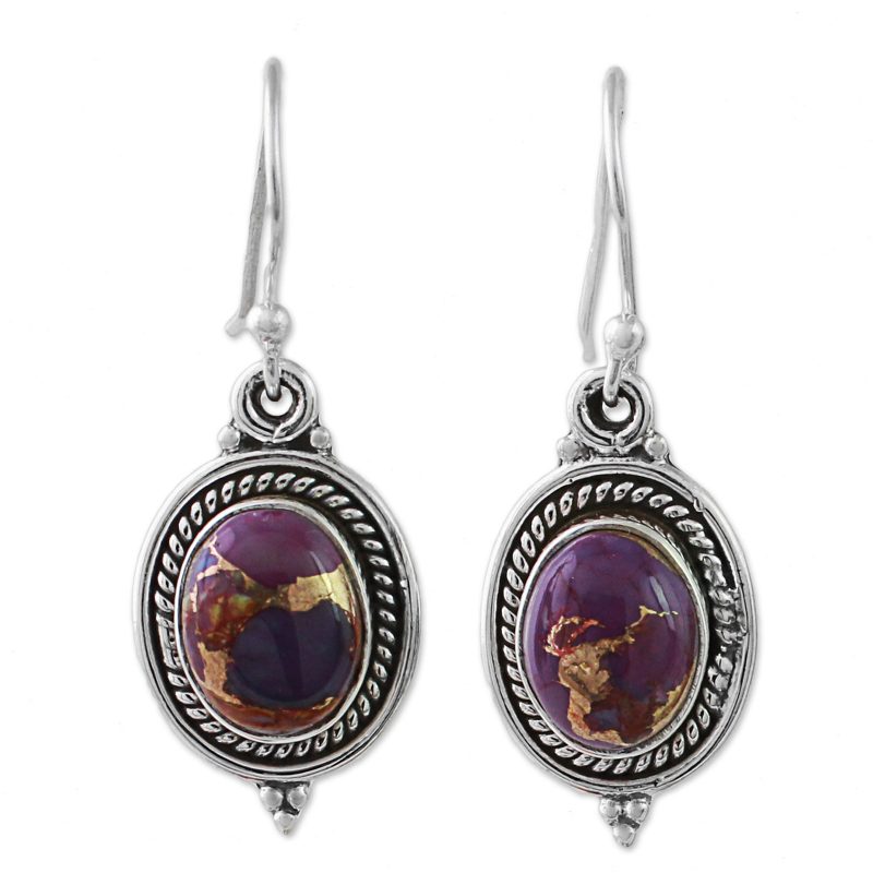This pair of handcrafted sterling silver dangle earrings from Indian artisan Aparna is inspired by the work of her father, who was also an expert jeweler. Featuring two stones of composite turquoise with deep purple hues, this design is sure to be noticed wherever it goes.