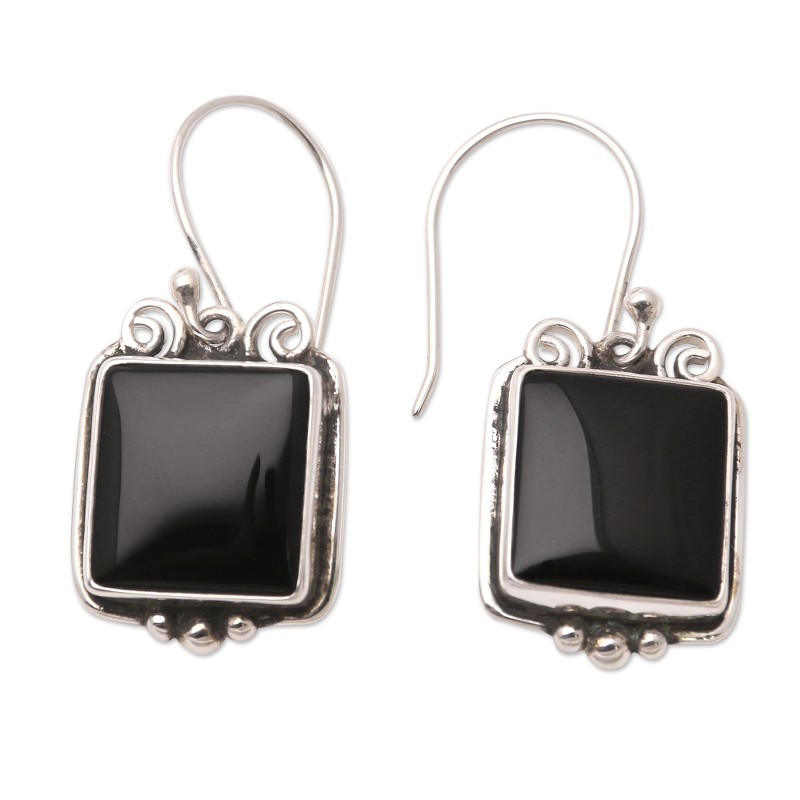 Backed by our Happiness GuaranteeThis sleek black and silver earrings were designed and crafted by the Mutiara Collection, a cooperative of Indonesian silversmiths whose name means "pearl" in English. The artisans craft the earrings with from a smooth square of onyx in a bezel setting, while sterling silver accents add shining details.
