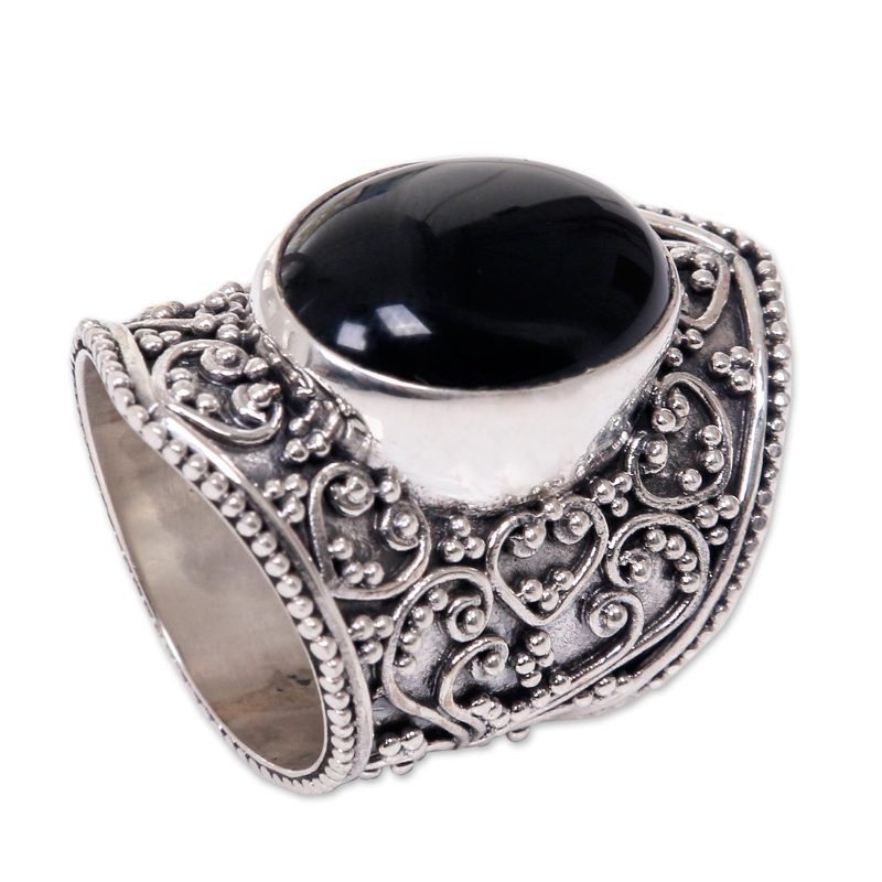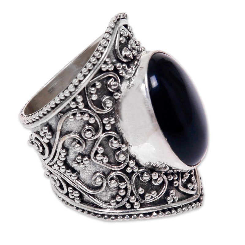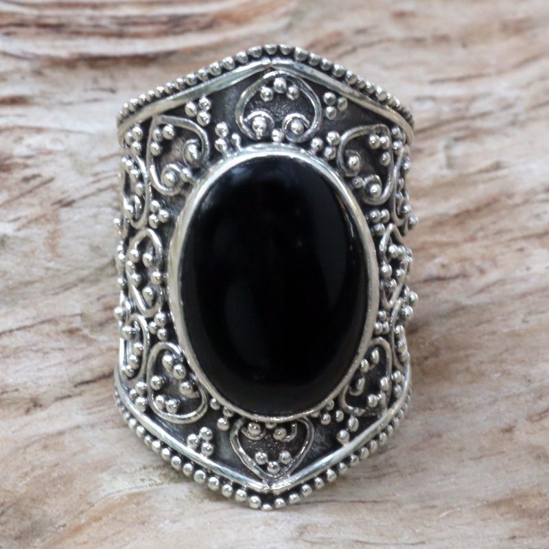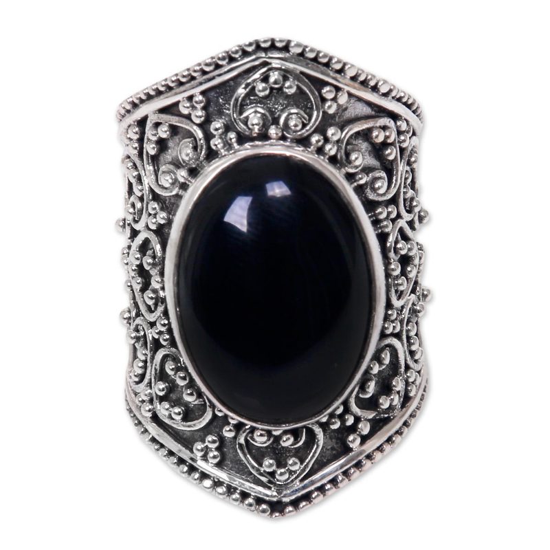 This intricate ring is made from black onyx and sterling silver with a combination finish. Indonesian artisan Made Sudiari crafts this ring by hand, adding detailed swirl and dot motifs in silver, which surround and accentuate the onyx stone excellently.