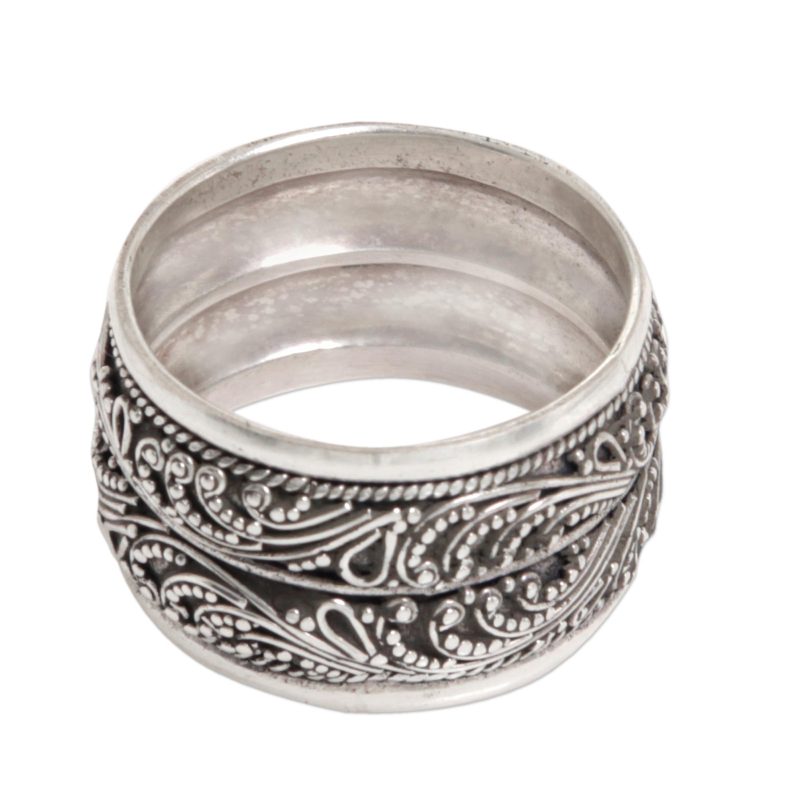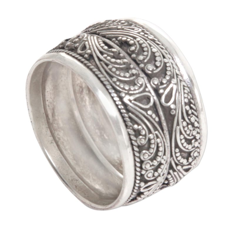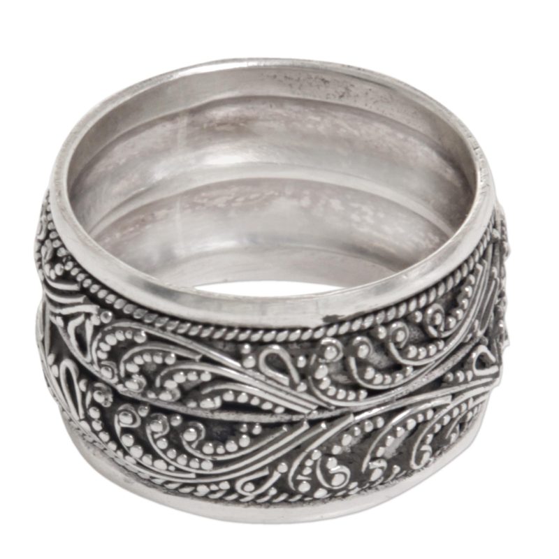 This wide band ring is handcrafted from sterling silver, with swirling Balinese motifs that capture the beauty of an Indonesian forest. Made Sudiari designs it, working alongside her family to create beautiful pieces of jewelry like this ring.