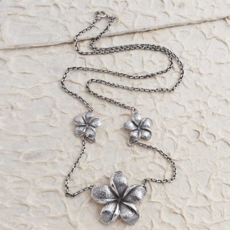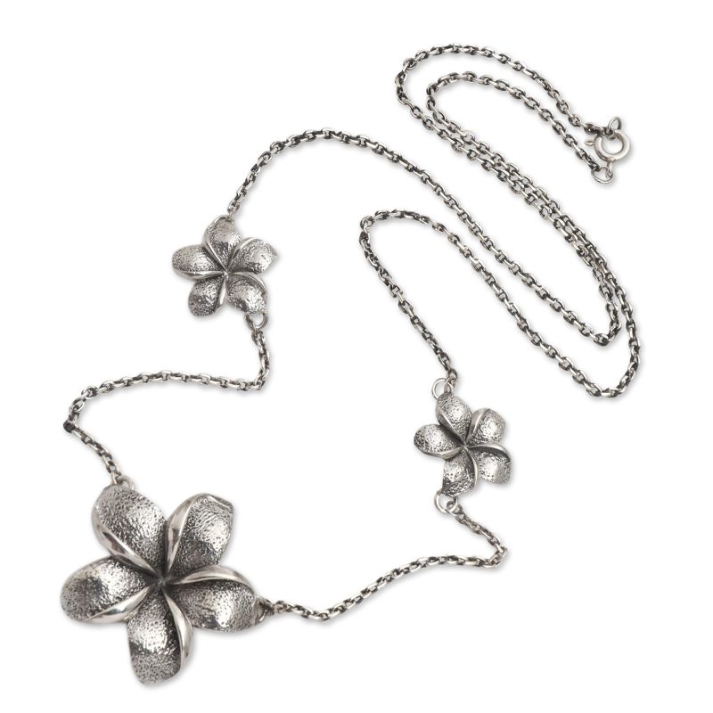 Three jepun flowers balance gracefully along an oxidized cable chain in this charming little station necklace from Bali's Yuniati. Crafted from sterling silver, the largest flower at the center is flanked by two smaller flowers positioned farther up the chain. The jepun flower, also know as frangipani, are a common theme in Balinese art.