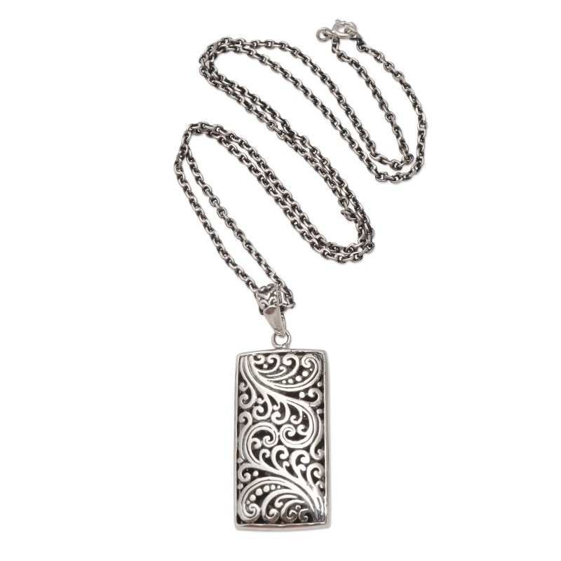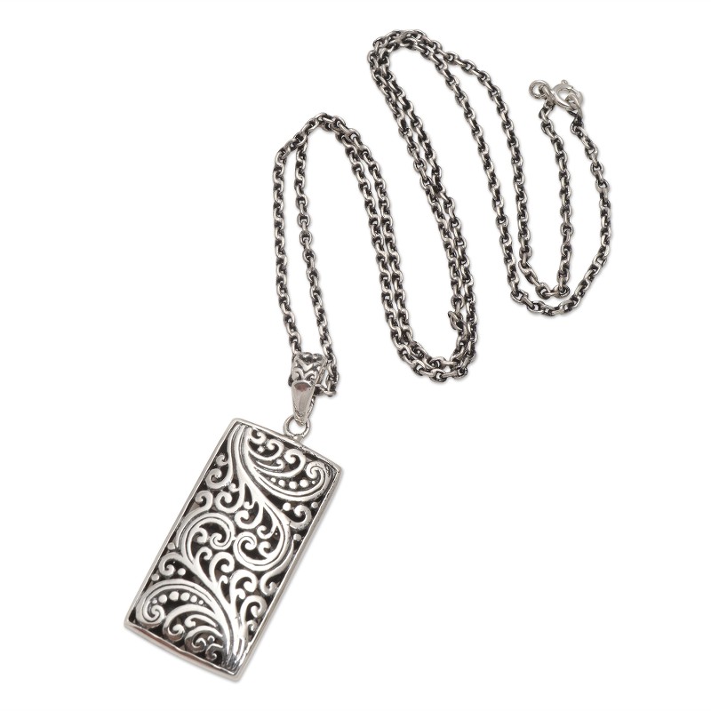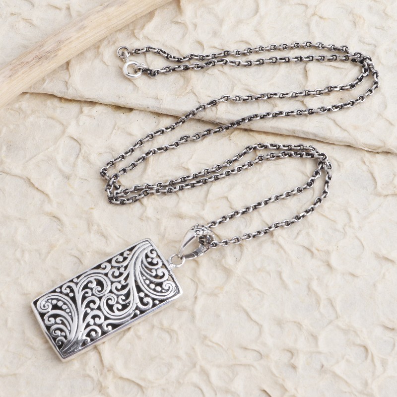 Backed by our 100% Happiness GuaranteeBali's Yuniati engraves the rectangular pendant on this charming necklace with traditional Balinese designs. Crafted from sterling silver, the necklace is equipped with a cable chain and completed with a combination finish.