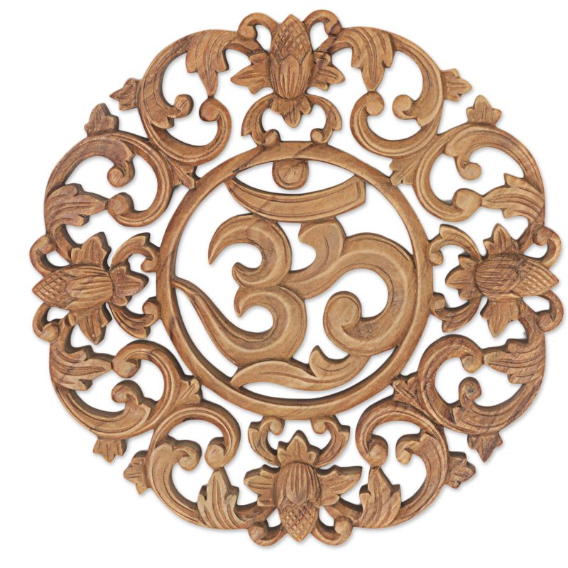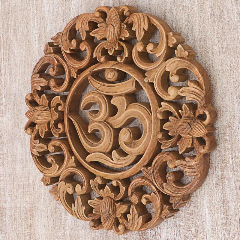 Floral motifs surround an elegant om symbol in this hand-carved wood wall relief. Om is a sacred symbol and mantra for Buddhist and Hindu traditions alike, associated with wellness and rejuvenation. It is crafted by Bali's Made Mulyani, who comes from a family of artisans.