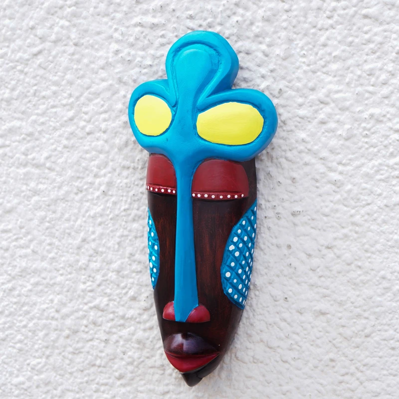 Designed by Ghana's Kobina Asmah, this spectacular African mask reveals a striking visage accentuated by gracefully elongated features and crowned by a remarkable headdress. Skillfully hand-carved from sese wood, the mask is brought to life through a captivating array of hand-applied colors, blending brown, blue, red, yellow and white harmoniously. This exquisite decorative accent imparts a sense of cultural richness and significance, seamlessly integrating into your surroundings.