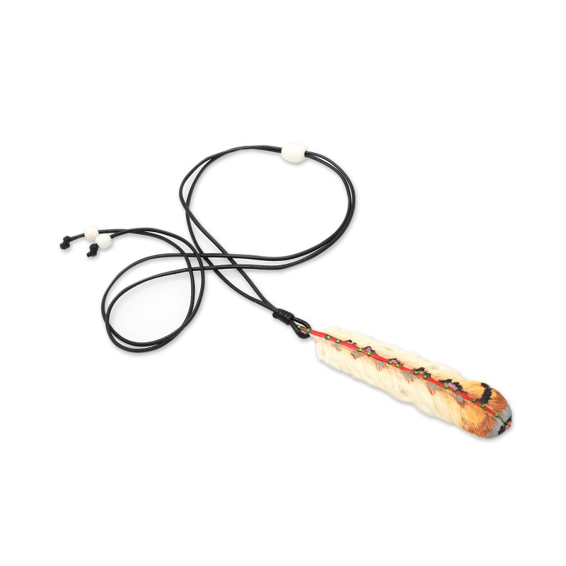 A symbol of freedom and a sign of personality, Ayu Ary's pendant necklace combines the traditional Balinese art style with a whimsical design that will express your inner self. Featuring an adjustable cotton cord in a black hue, the accessory has a bone-carved feather painted in brown tones, a color usually associated with Earth energy and stability.
